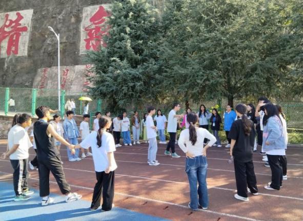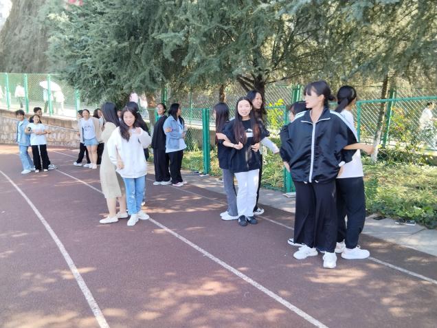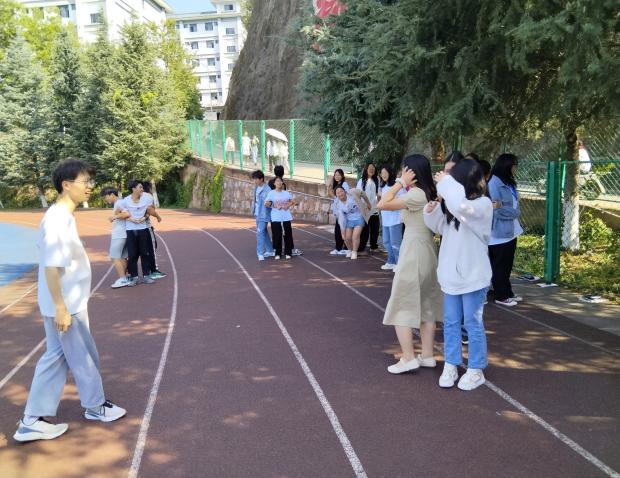 活动的第二个环节是落起坐:大家背对背,手扣手,从两人增加到三人再增加到五人,人数越来越多,难度越来越大。同学们坐下去,站起来,哪个组站的慢、哪个组输,惩罚输的组表演才艺。游戏进行到最后,迎来最大挑战,所有人一起背对背手扣手围成一个大圈,一起坐下去再站起来,大家都配合的非常默契,完美地完成了这个巨大的挑战。