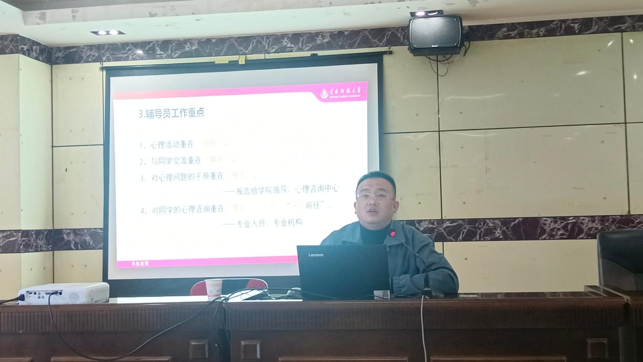 为进一步加强辅导员对学生心理危机识别预防与干预的工作认识,掌握有效的危机干预和处理方法,提高工作技能,大学生工作部邀请到云南师范大学王友良博士于2024年11月29日在行政楼四楼大会议室开展心理危机识别干预专题培训,全体学生管理人员、辅导员和驻楼辅导员共128参加此次培训。