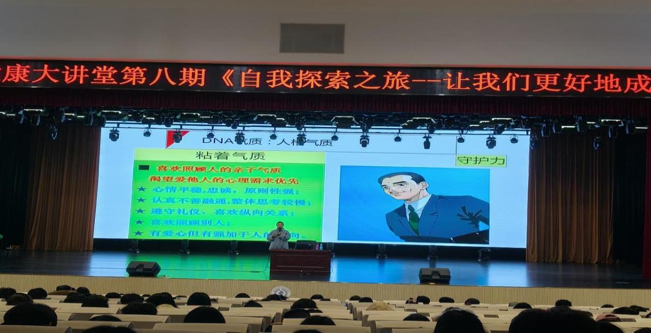 在讲座中,赵老师还交给了同学们三个认识自己的法宝。第一个法宝是个人气质,包括DNA气质和ABC三个类型的气质,并传授了自我护理方法和有效的支援法,告诉大家气质没有好坏之分,希望同学们可以活出自己的遗传气质,活出最真实的自己。第二个法宝是同行者,自我意识的发展与人际关系密不可分,良好的人际交往有助于提高自我意识和评价能力,促进自我意识和社会意识的统一,还能够在跟人相处的过程里获得反馈,在交往行为中获取关于自己的信息,从而更好地认识自己。第三个法宝是反思站,自省是认清自己的必修课,也是锻炼自己的必经之路。同学们在面对内心的恐惧和挑战时,要努力形成积极的自我暗示,建立正确的认识观念,树立恰当目标,接受合理批评,学会欣赏别人。
