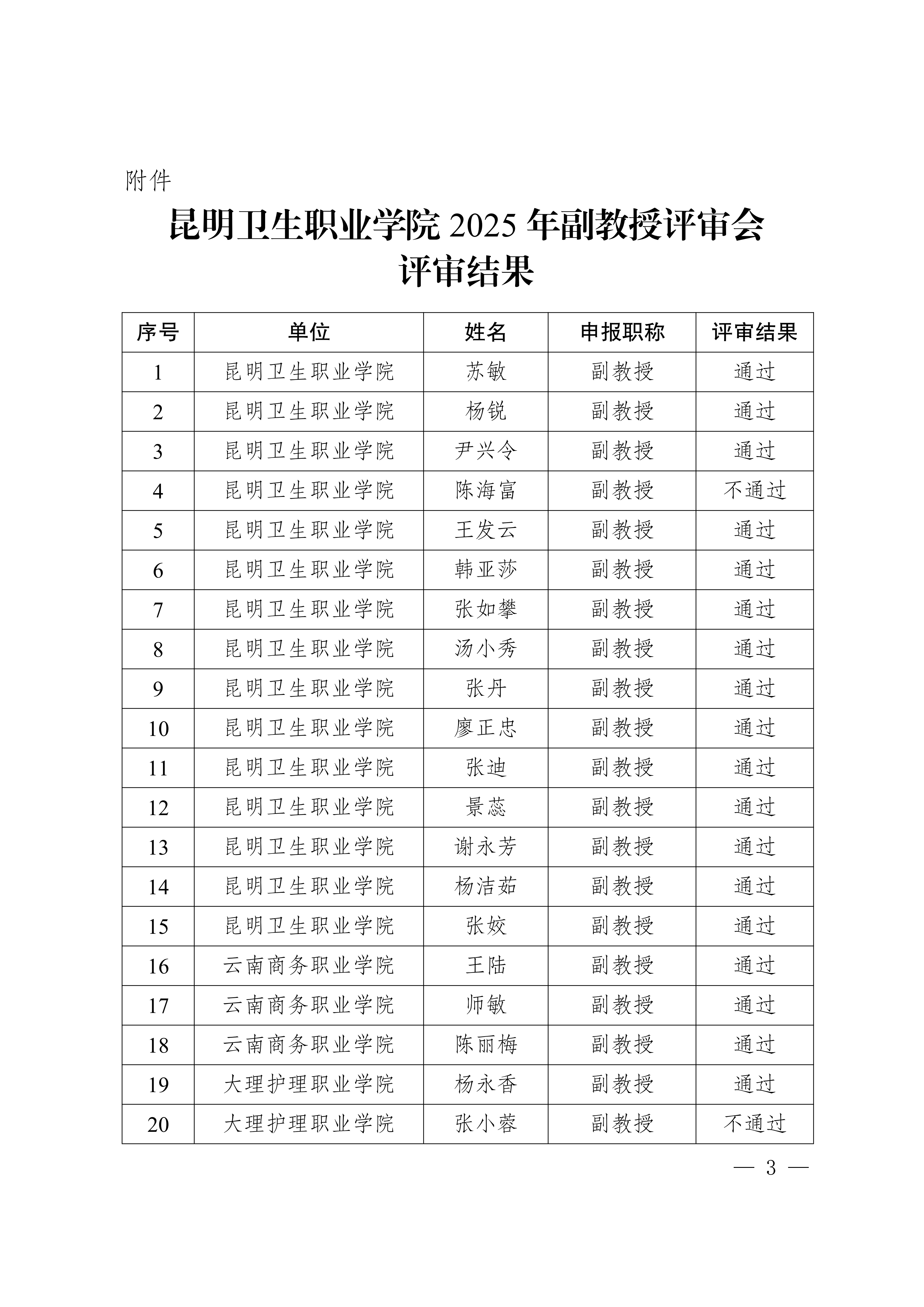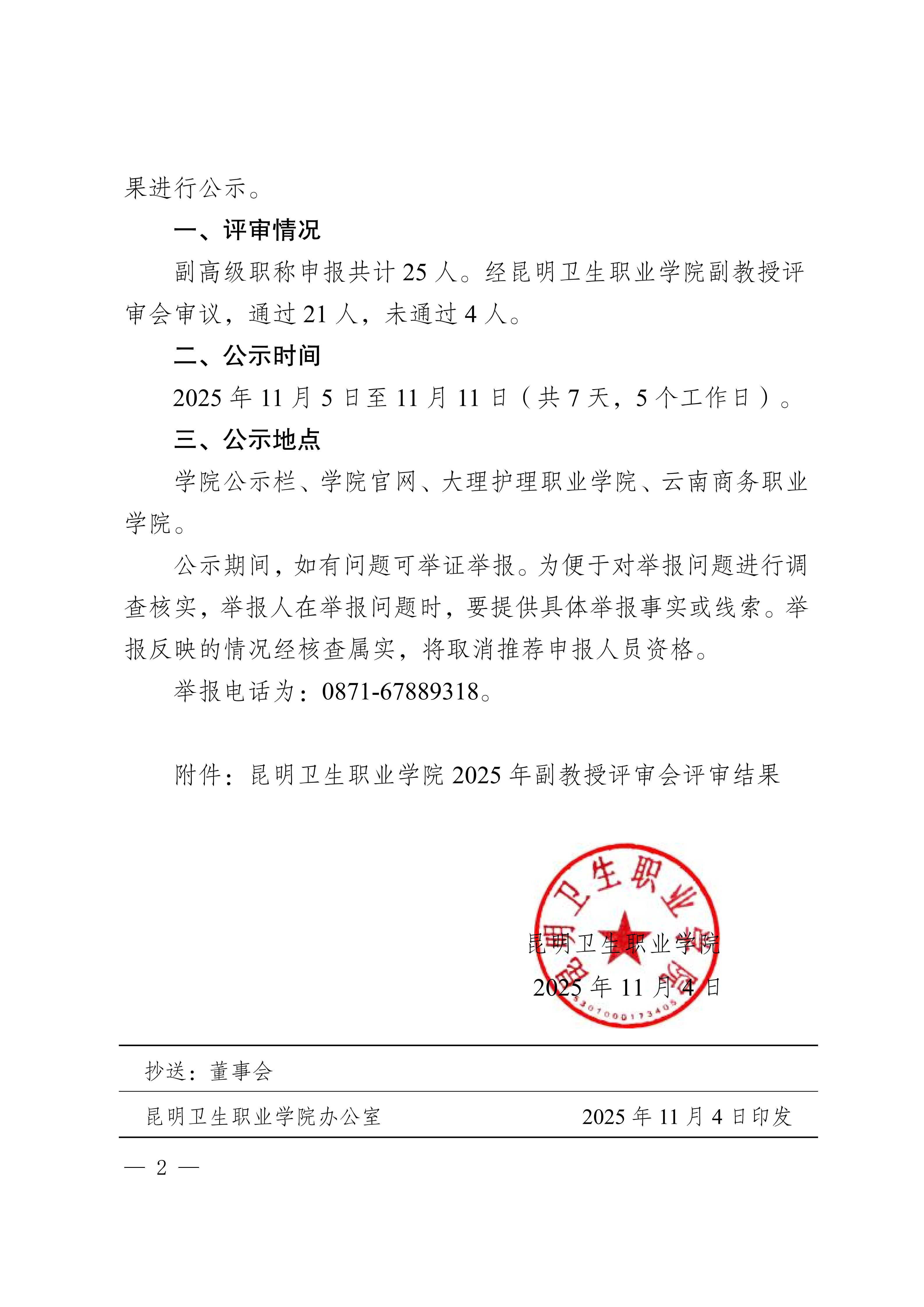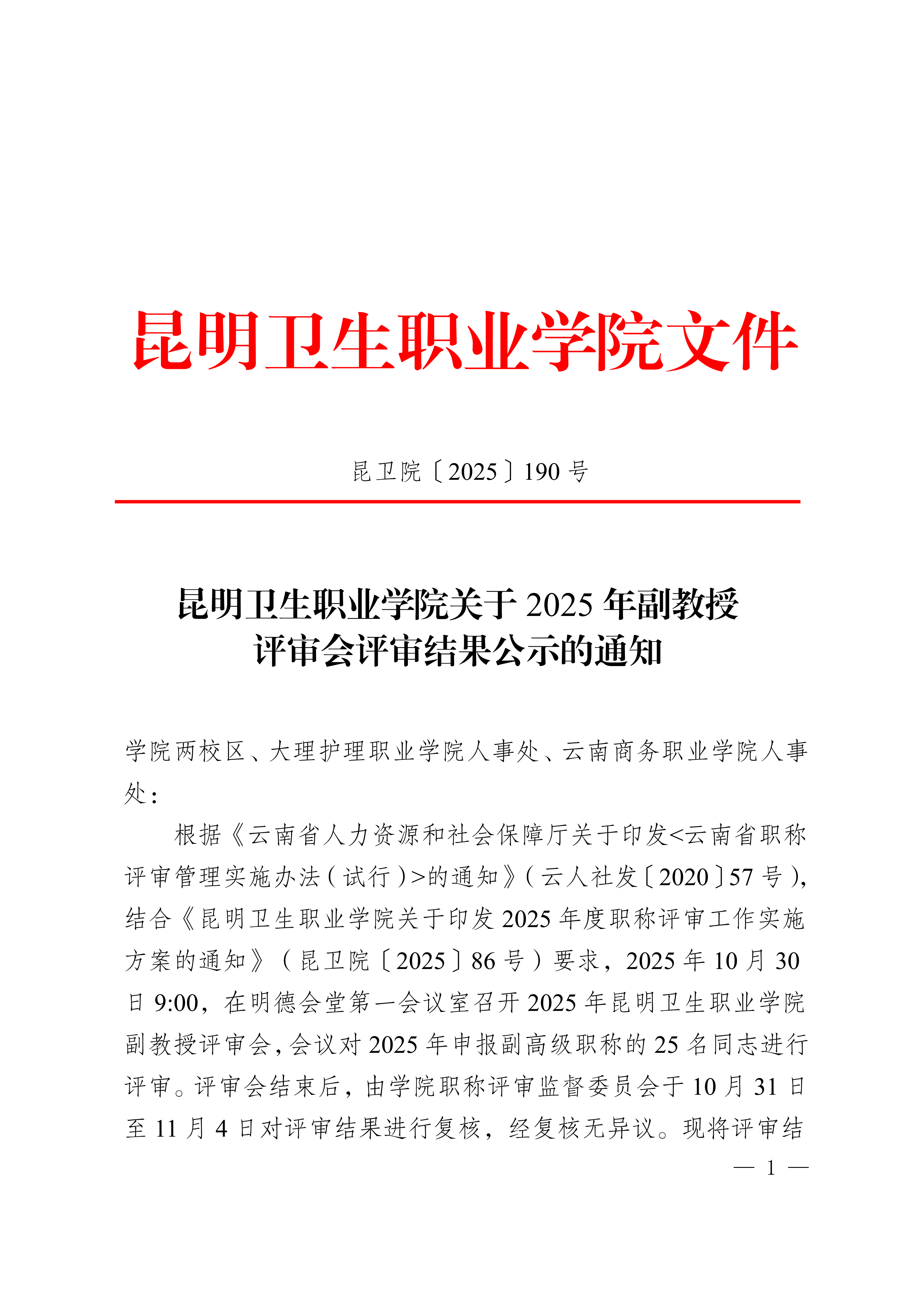 昆卫院〔2025〕190号 KY开元集团官网入口关于2025年副教授评审会评审结果公示的通知