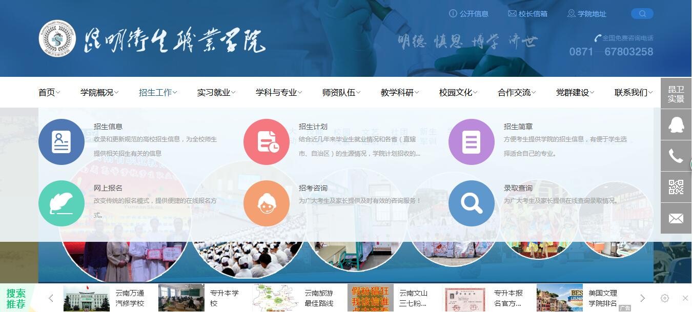 设置了考生录取查询等窗口,方便学生查询录取信息等。对招生信息等实施更新及推送,2016-2017年招生工作方面在校园网站上共发布招生信息、招生简章等信息17条,并在校园网站上公布了学院2017年招生计划,及时更新学院补录信息等。2017年学院共开设14个专业(临床医学、中医骨伤、针灸推拿、口腔医学、护理学、助产、医学检验技术、医学影像技术、药学、 康复治疗技术、医疗设备应用技术、药品生产技术、中医学、医学美容技术)。在学院微信公众号共发布招生信息、招生简章等信息11条。在各类招生平台、招生简章中,明确招办咨询电话、电子邮箱,一方面方便考生及家长及时咨询,另一方面主动接受考生和社会监督。