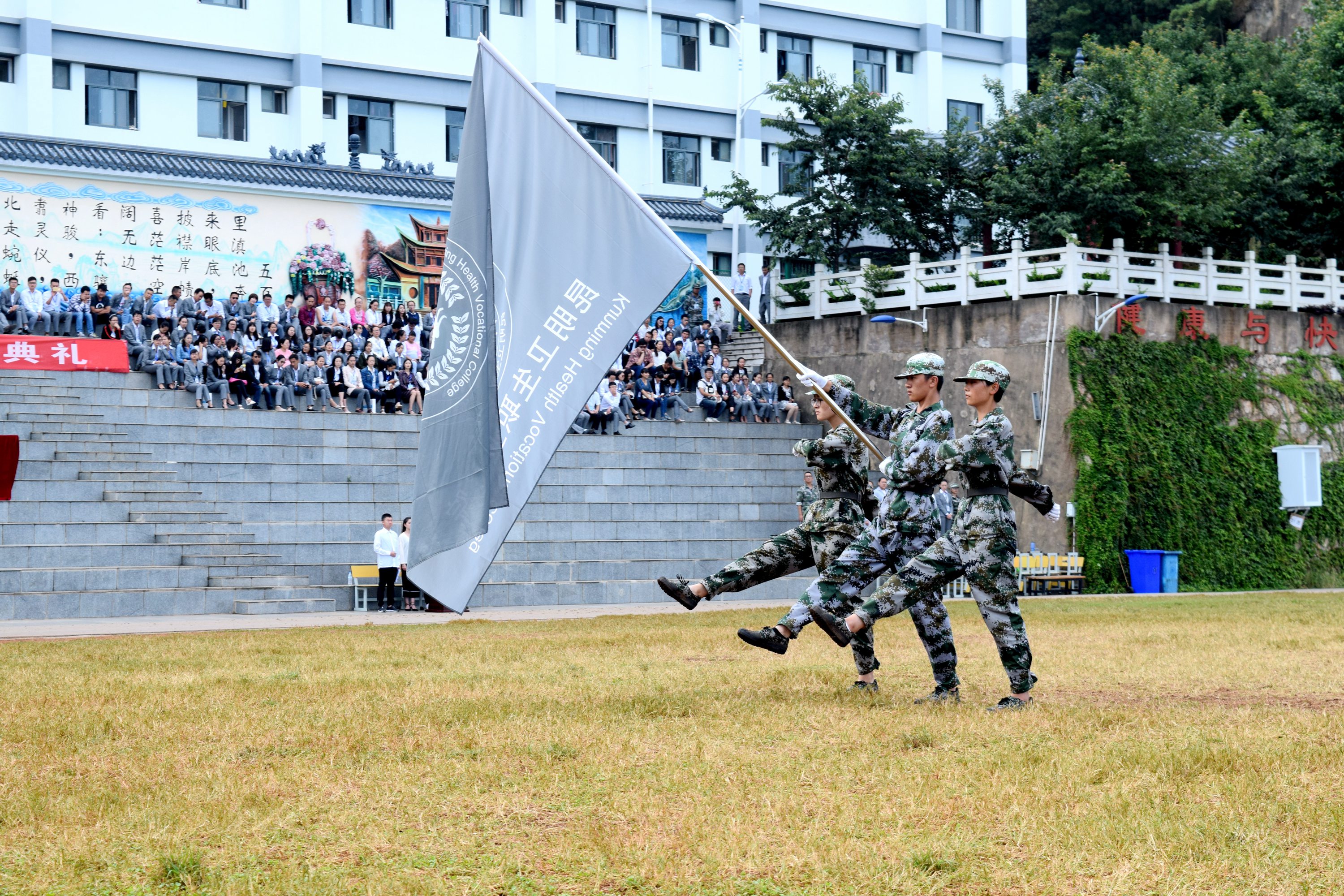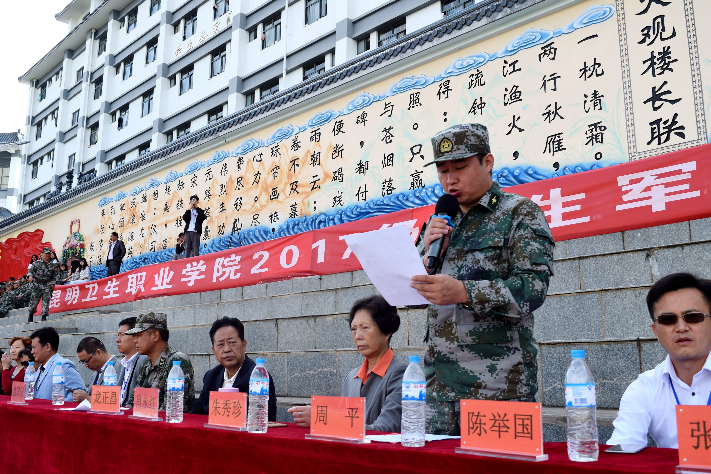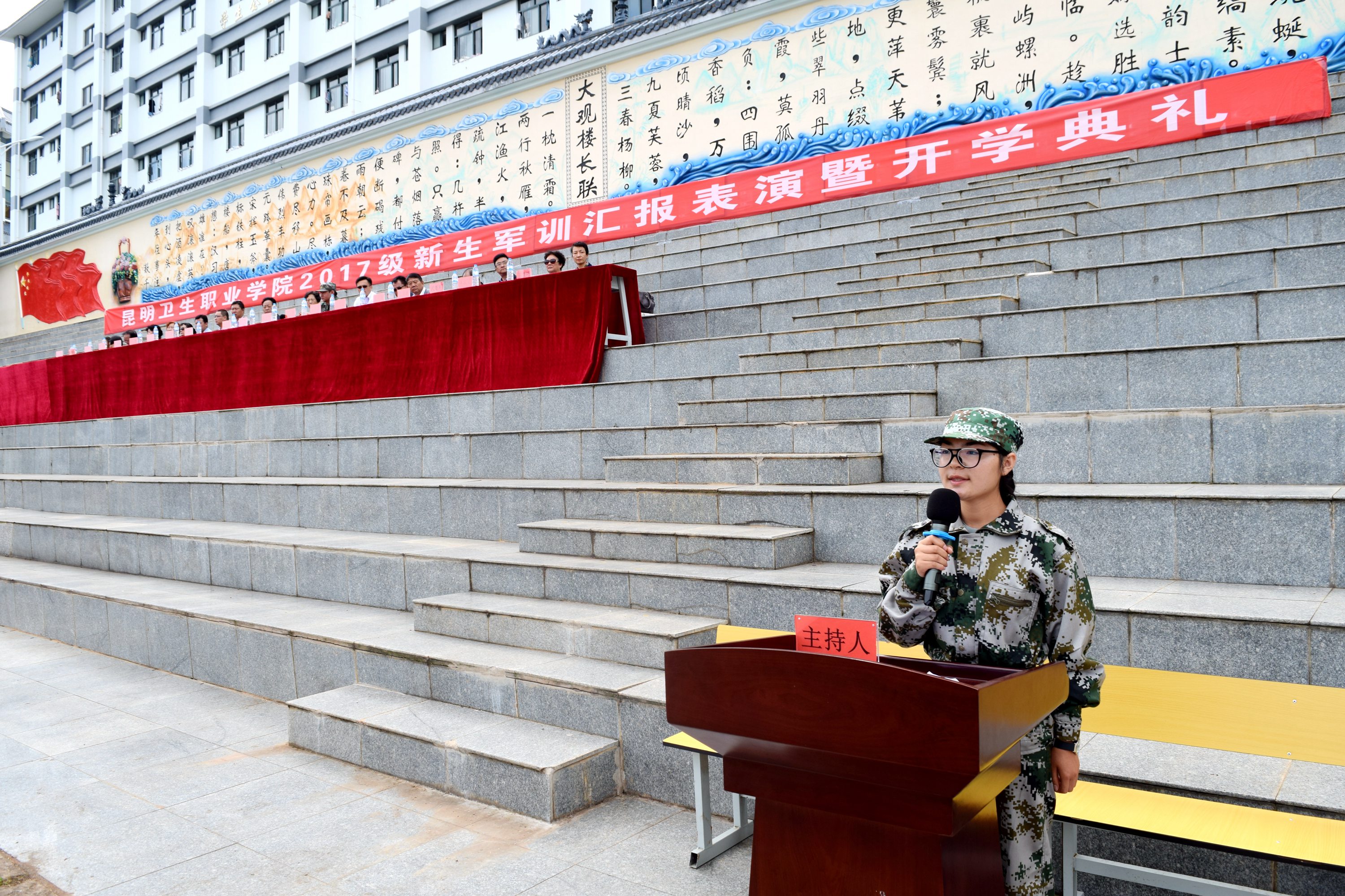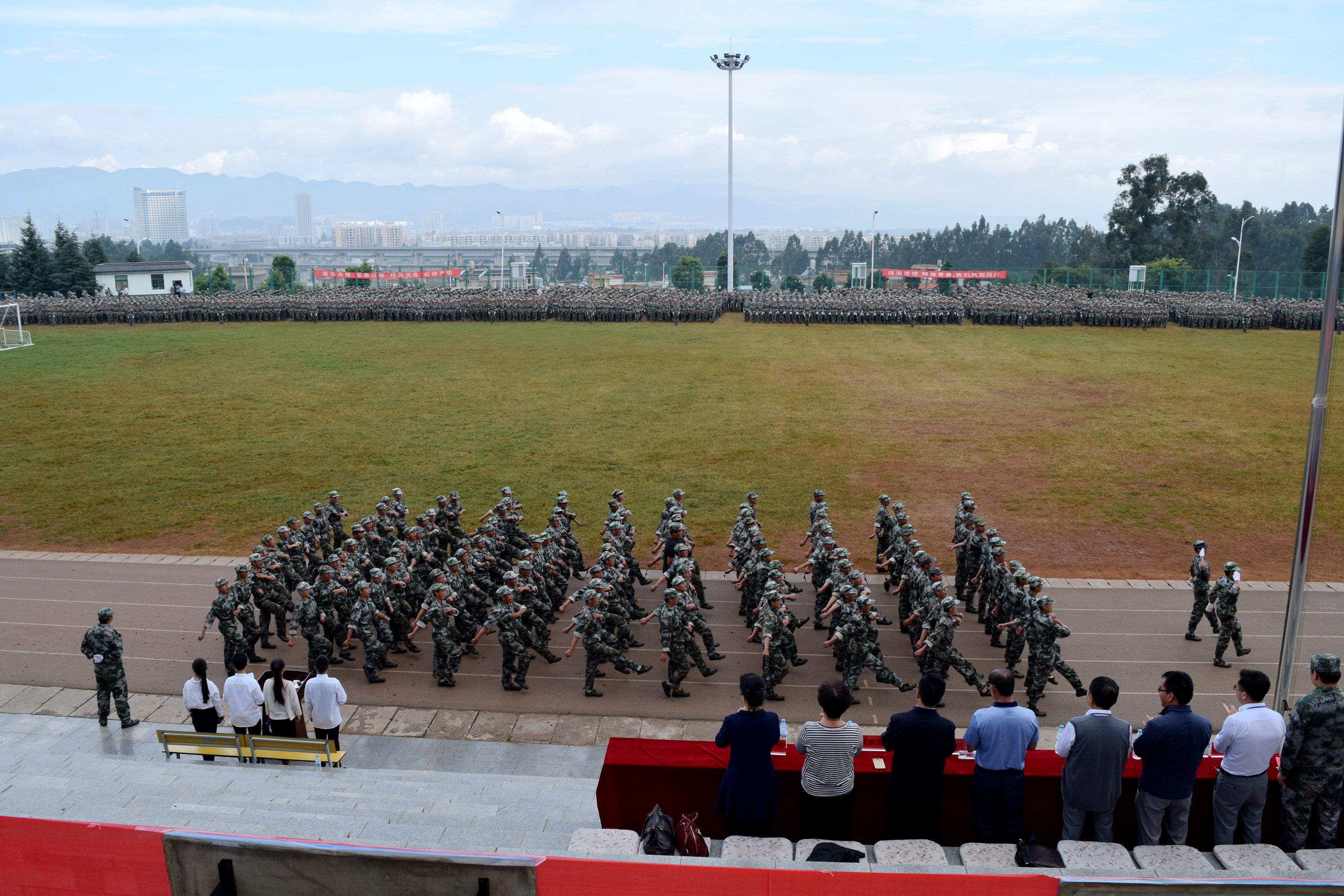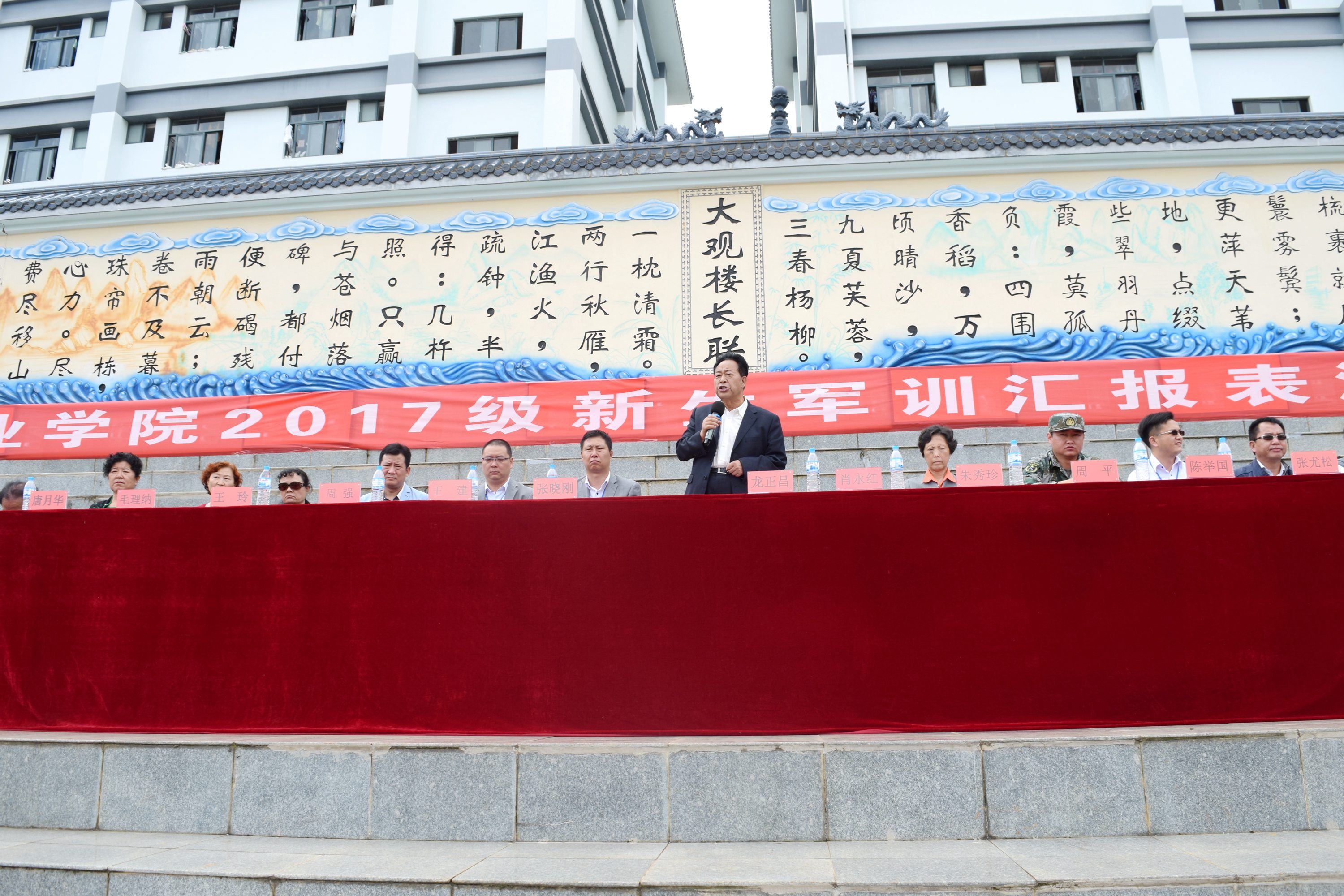 9月4日,KY开元集团官网入口2017级新生军训汇报表演暨开学典礼在足球场隆重举行。出席的领导有云南昆卫教育集团理事长、KY开元集团官网入口党委书记、院长龙正昌,云南昆卫教育集团副理事长朱秀珍女士,承训单位总教官肖永红中校,集团实习就业处、招生外联部等部门负责人,学院党政领导。新生班主任和部分教师前来观礼。