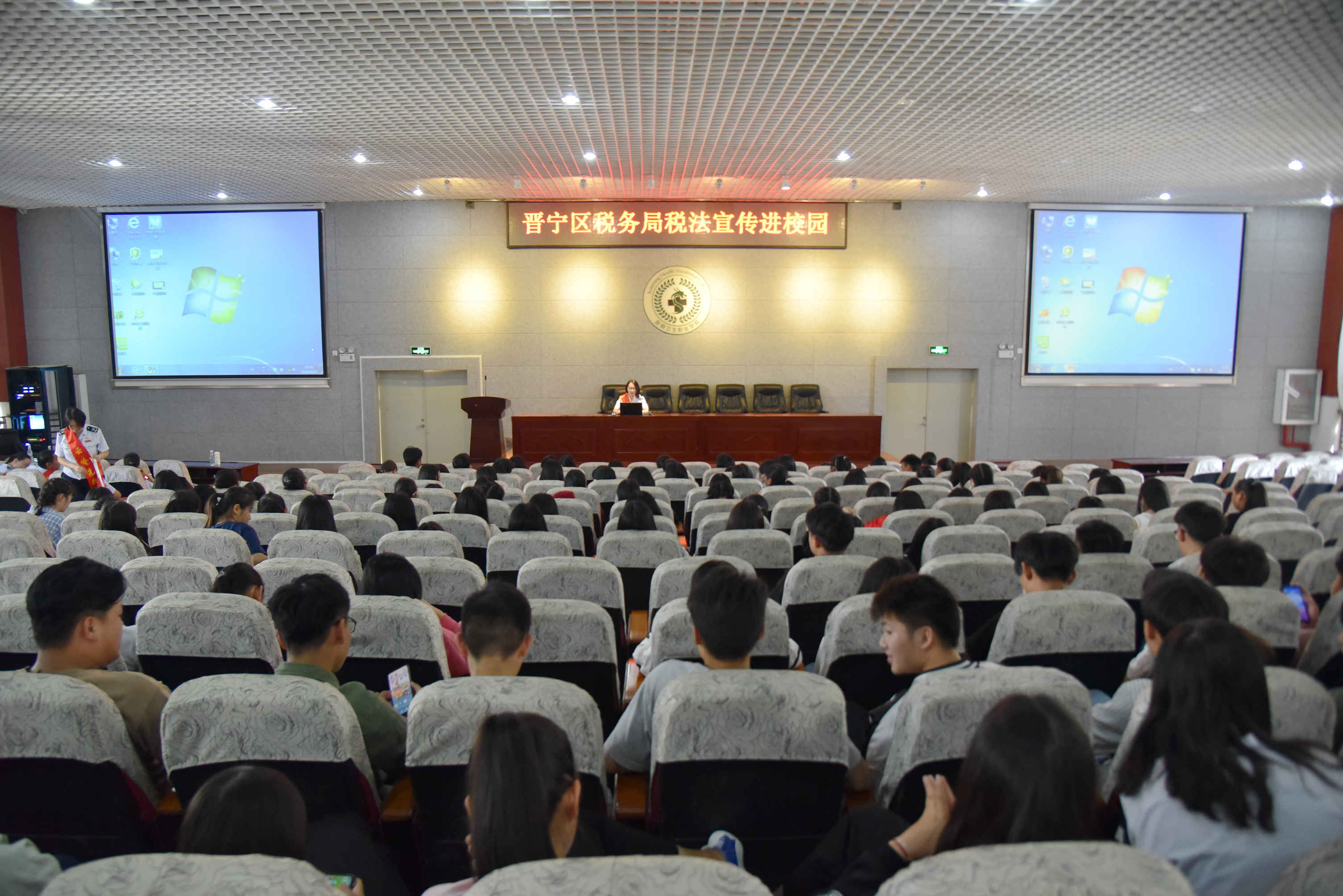 在学术报告厅,税法宣讲员王丹结合税收宣传月减税降费的主题为300余名学生上了一堂生动的税收知识课,以贴近生活的语言和事例,让同学们知晓了税收的发展历史和重要意义,传达纳税是每个公民的义务的理念。