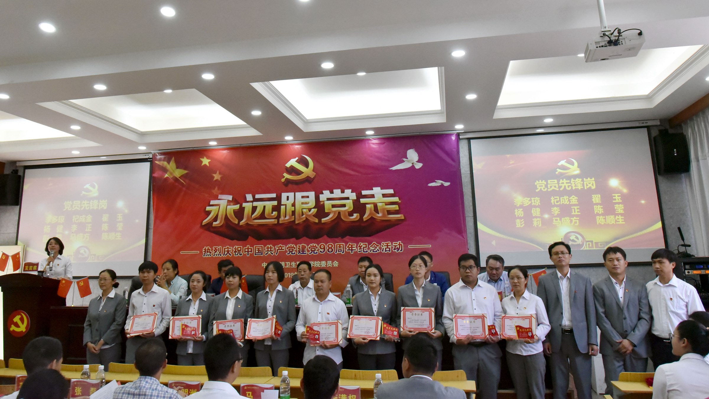 党委委员、副院长周平宣读了党委关于表彰先进集体、优秀个人和各党支部表彰党员先锋岗的表彰决定。2个先进基层党支部、2名优秀党支部书记、7名优秀党务工作者和14名优秀共产党员受到党委表彰,18名党员被支部授予党员先锋岗荣誉称号。主席台就坐领导和各党支部负责人为受表彰的集体和个人颁奖。