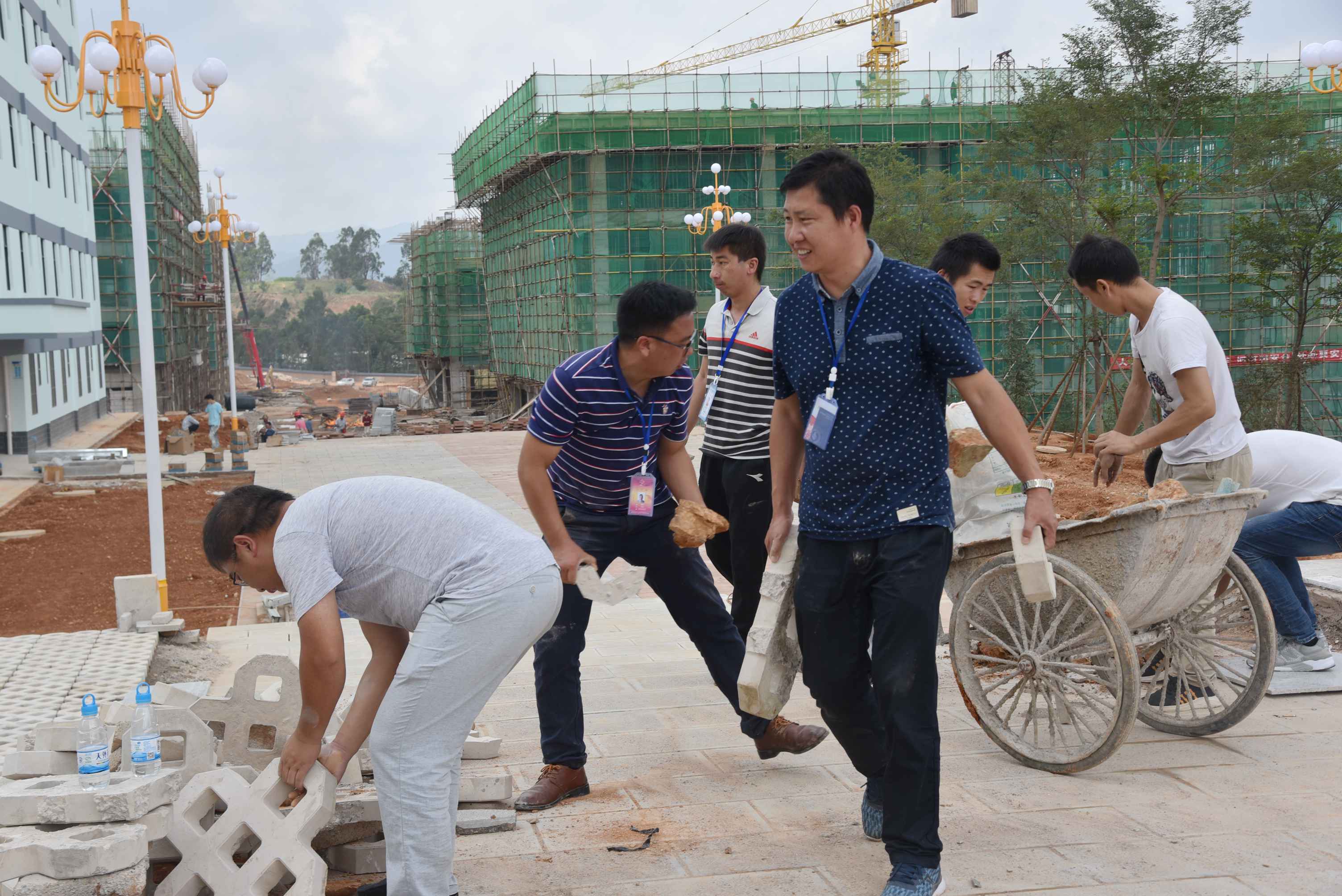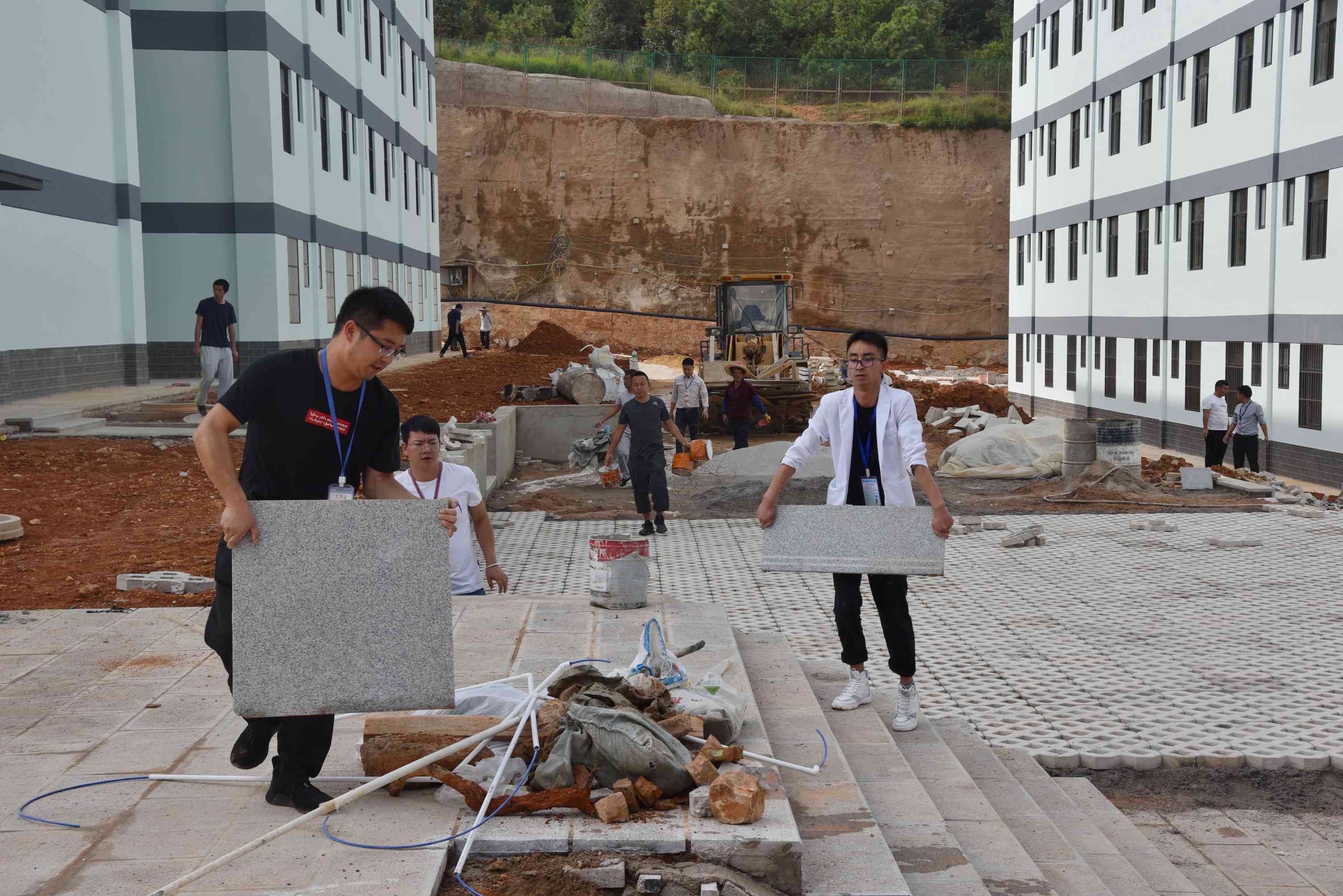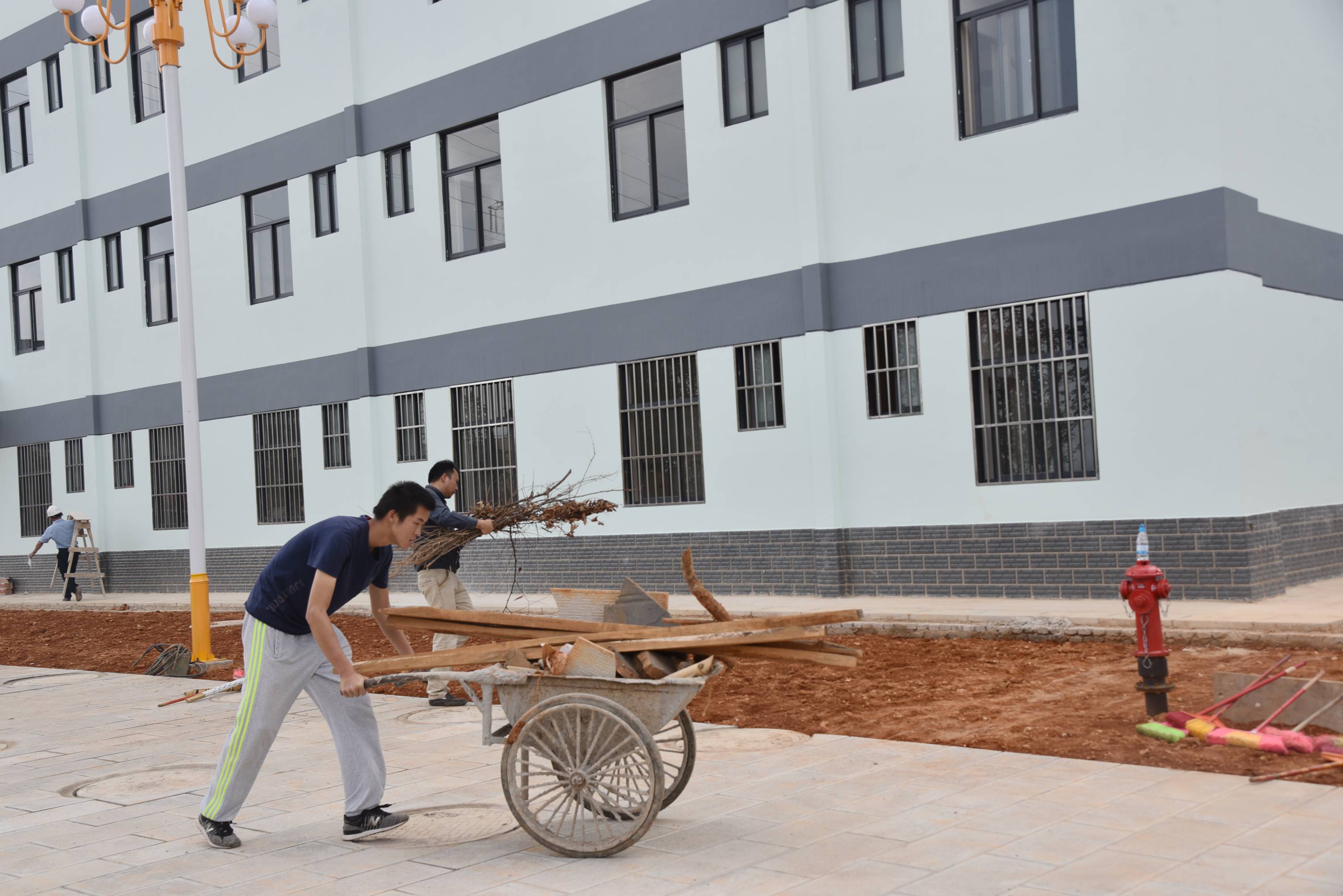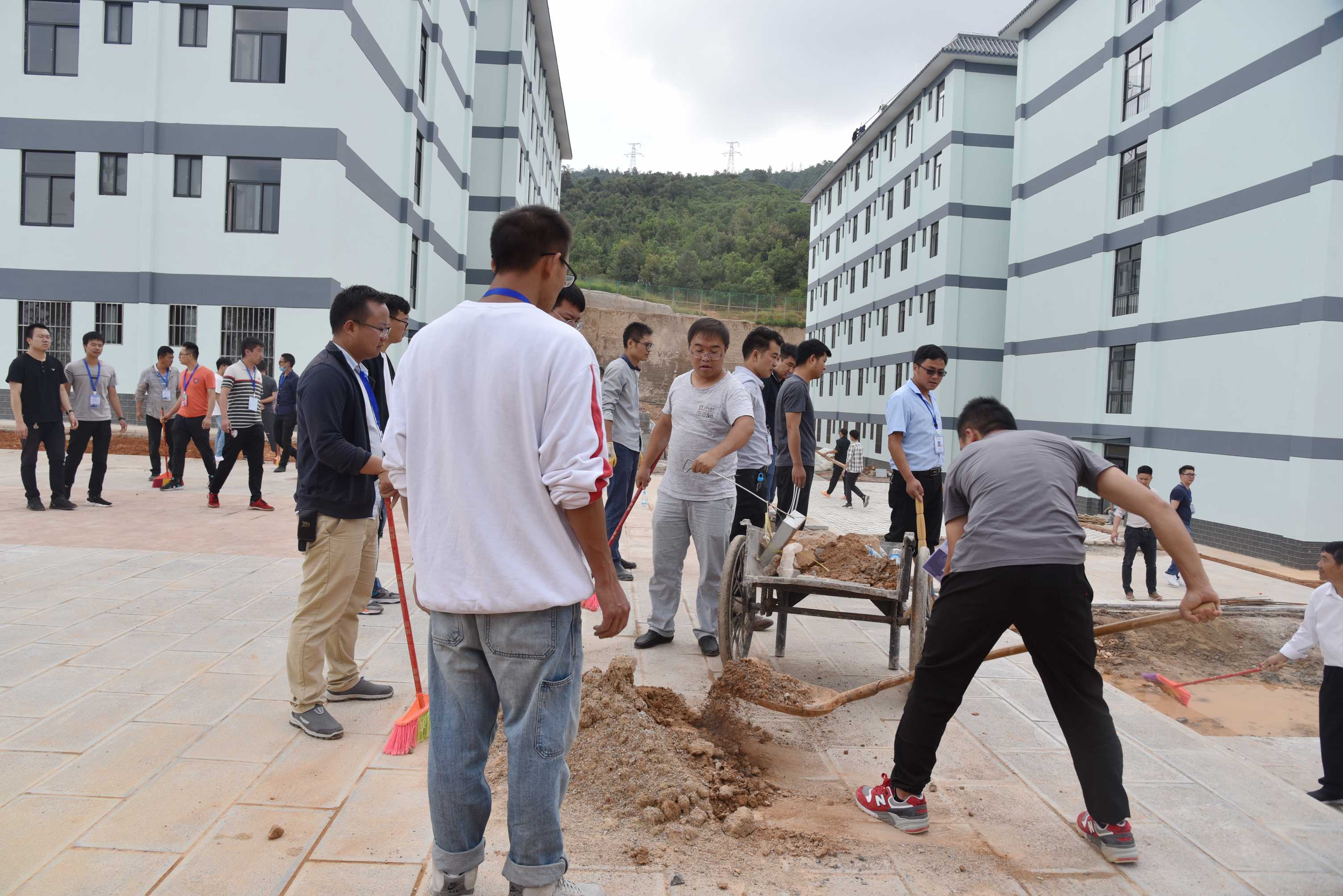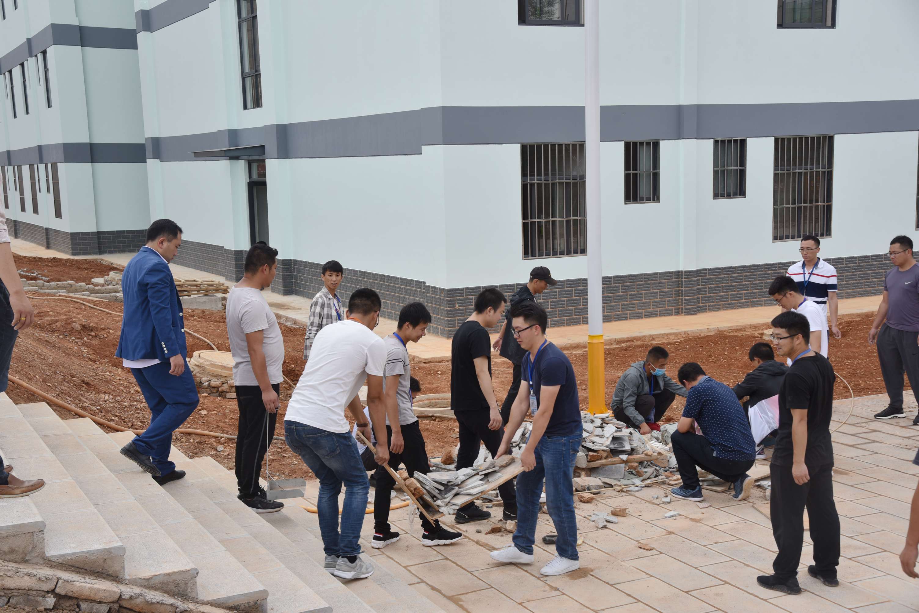 党委委员、副院长周平带领男老师清理宿舍外围空地