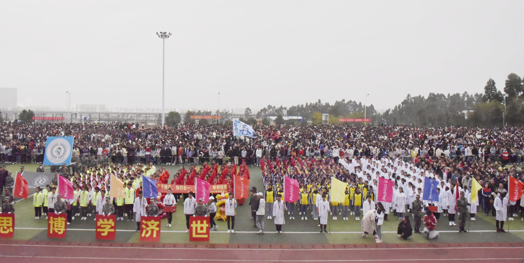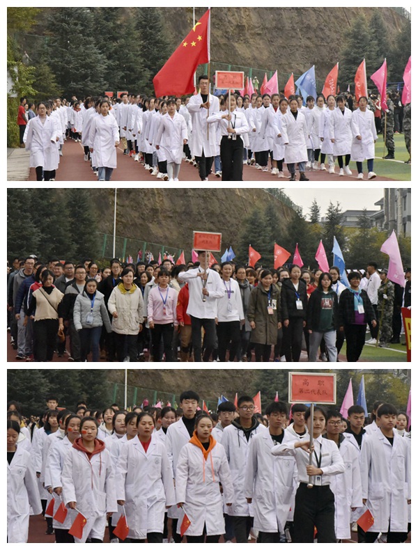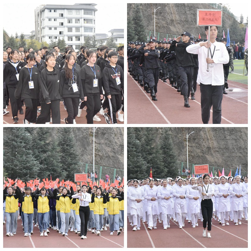 伴随着欢快的运动员进行曲和主持人解说,入场式正式开始。国旗、校旗、校徽、彩旗队等方队首先入场,紧跟其后的是志愿者方队、4个五年制运动员代表队、2个三年制大专运动员代表队和1个教师运动员代表队,以及学生社团代表队和大学生艺术团表演方队,他们以稳健的步伐,嘹亮的口号步入会场,走过主席台,接受全院师生的检阅。