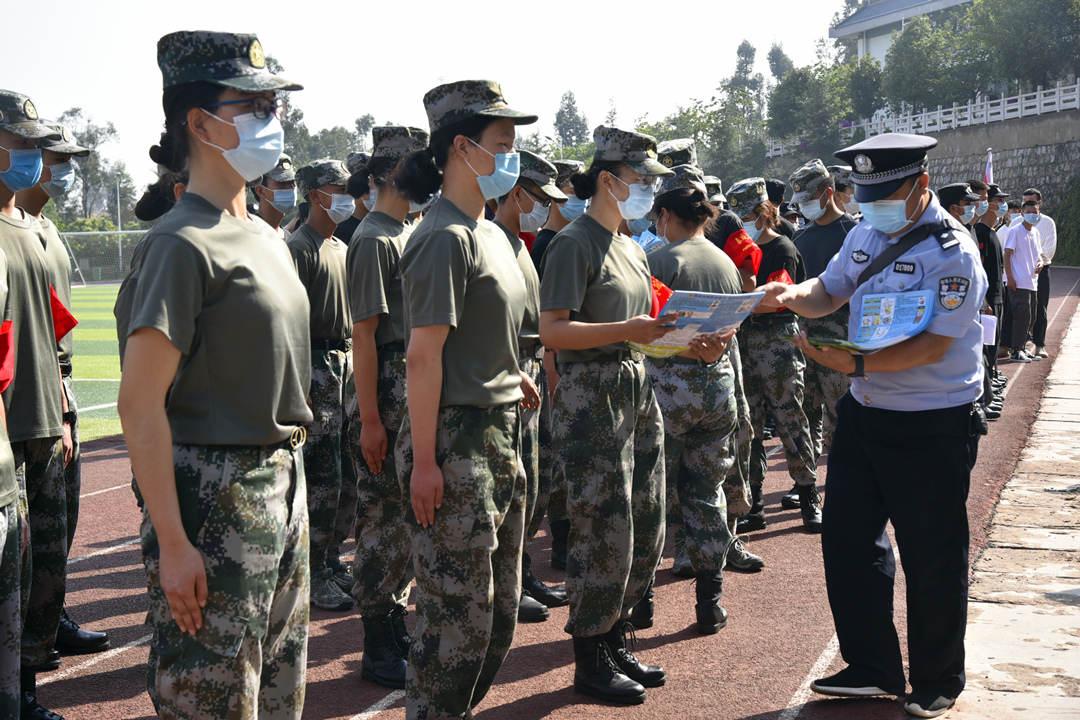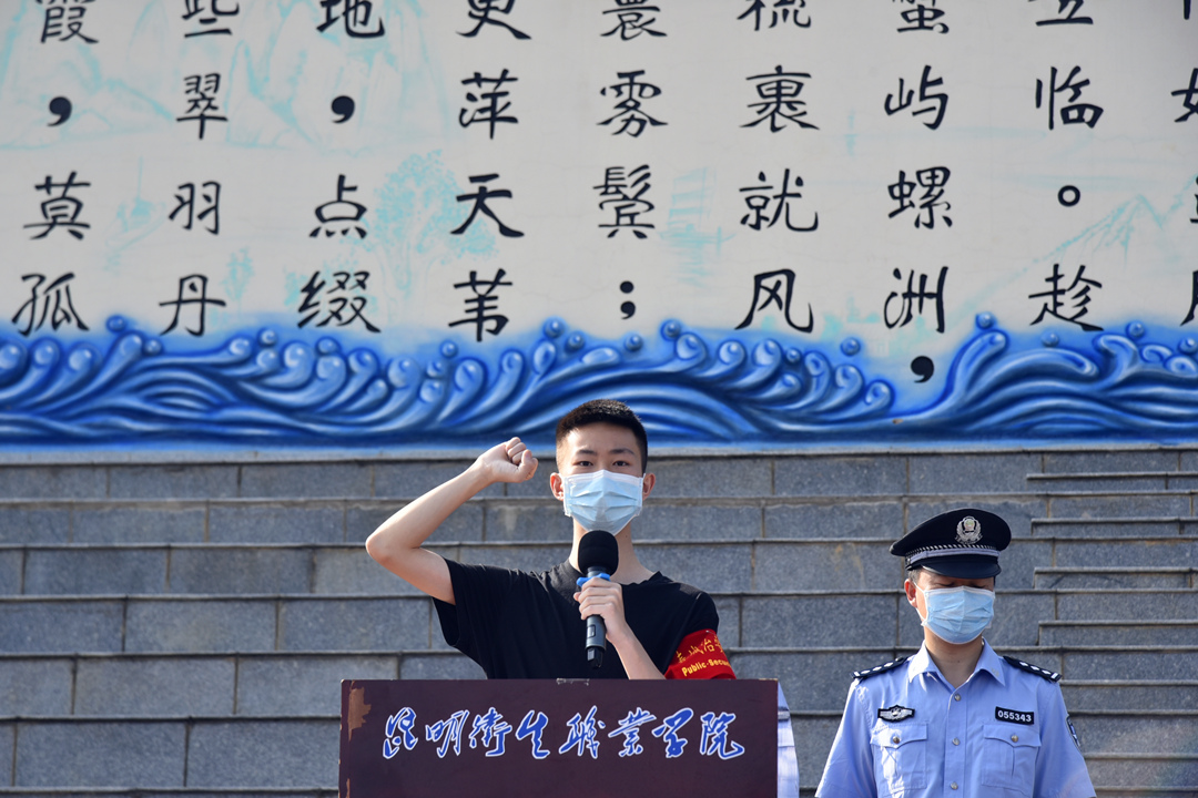 治安志愿者代表2016级五年制药学1班金振烨同学上台发言并带领全体志愿者宣誓。