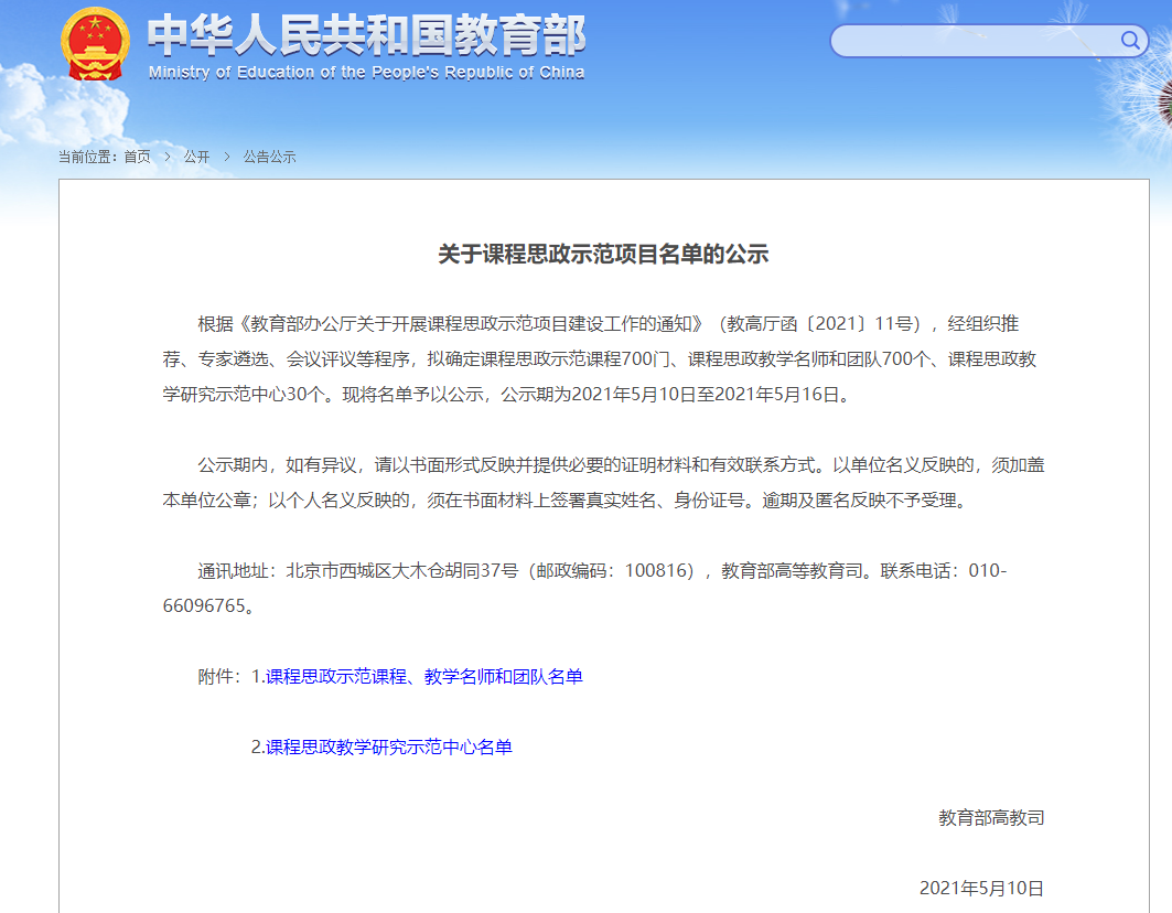为深入贯彻落实习近平总书记关于教育的重要论述和全国教育大会精神,贯彻落实中共中央办公厅、国务院办公厅《关于深化新时代学校思想政治理论课改革创新的若干意见》,深入实施《高等学校课程思政建设指导纲要》,教育部办公厅发布《教育部办公厅关于开展课程思政示范项目建设工作的通知》(高教厅函[2021] 11号),开始开展课程思政示范项目建设工作。2021年3月《药理学》课程通过省级评审,被云南省教育厅推荐参评全国课程思政示范课程、教学名师和团队;2021年5月10日,经组织推荐、专家遴选、会议评议等程序,教育部公示拟确定KY开元《药理学》课程为课程思政示范课程、教学名师和团队。