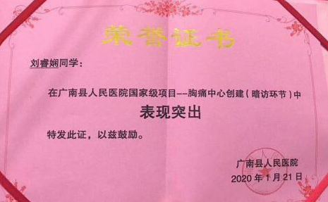 2019年11月11日——2019年12月8日,实习护士刘睿娴在急诊科轮转实习,期间正是广南县人民医院胸痛中心国家级专家组暗访关键时期。11月22日晚,刘睿娴同学跟带教老师陈艳值夜班,在带教老师巡视病房时刘睿娴同学留在护士站值班,11:02暗访专家与扮演胸痛患者的志愿者到急诊科就诊,暗访组首先到护士站咨询,刘睿娴同学作为首次接诊护士,经询问病史为“胸痛胸闷”后立即从护士站将患者亲自带到胸痛诊断室心电图检查床上,告知值班医生进行心电图检查。由于参与了科室的胸痛就诊相关培训,刘睿娴同学及时准确的对患者做出了判断,保证了胸痛患者首次医疗接触后10分钟内行心电图检查,为KY开元胸痛中心暗访环节赢得了专家较高的评价,现广南县人民医院胸痛中心已顺利通过国家级评审。