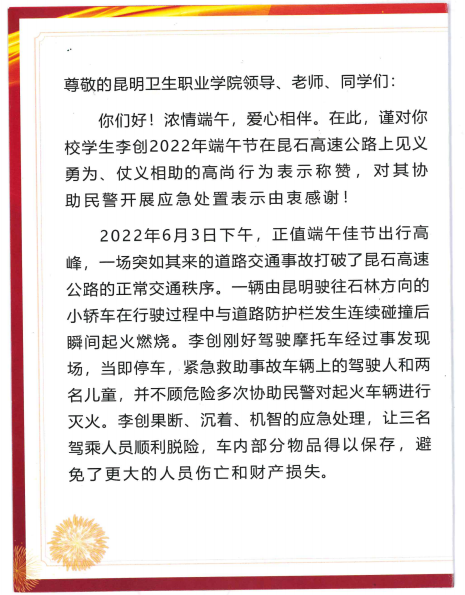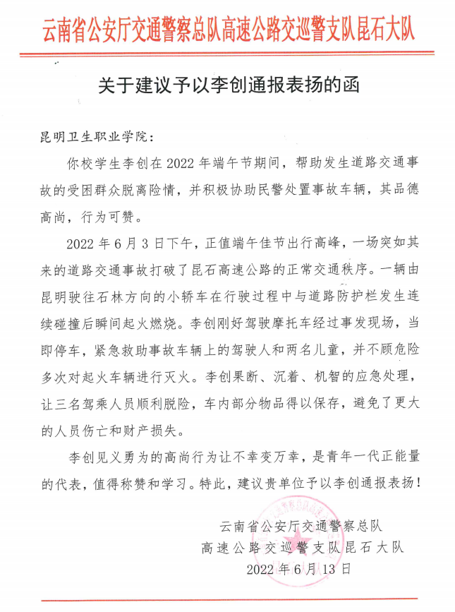 2022年6月3日,恰逢端午节。KY开元集团官网入口2020级高职影像6班学生李创驾驶着摩托车回家。途经昆石高速木喳箐路段时,看到前方一辆小轿车撞到护栏后起火。看到这种情况后,李创当即把摩托车停靠在路边,不顾危险紧急救助事故车辆的驾驶人和两名儿童,并向路边过往车辆呼救,借助灭火器多次对车辆进行灭火。由于他果断、沉着、机智的应急处理,让三名驾乘人员顺利脱险,车内部分物品得以保存,避免了更大的人员伤亡和财产损失。