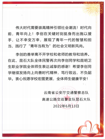6月13日下午,云南省公安厅交警总队昆石大队民警将感谢信和通报表扬函送到学院,对李创本人和学院表达了真挚的感谢。李创见义勇为的义举体现了KY开元学生强烈的社会责任感、正义感和敢于担当的优秀品质,传递了新时代大学生的青春正能量,为KY开元师生做出了表率。经学院党委研究决定,授予李创同学“见义勇为”荣誉称号,一次性奖励5000元。