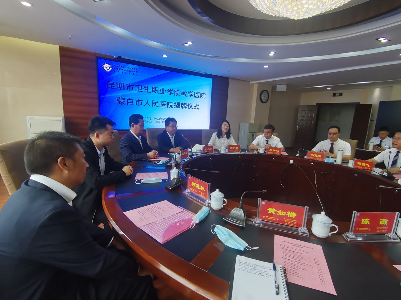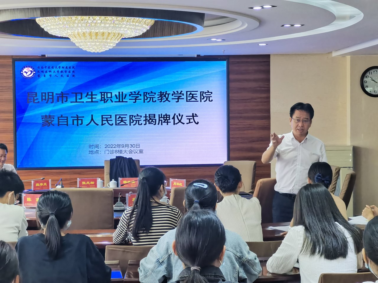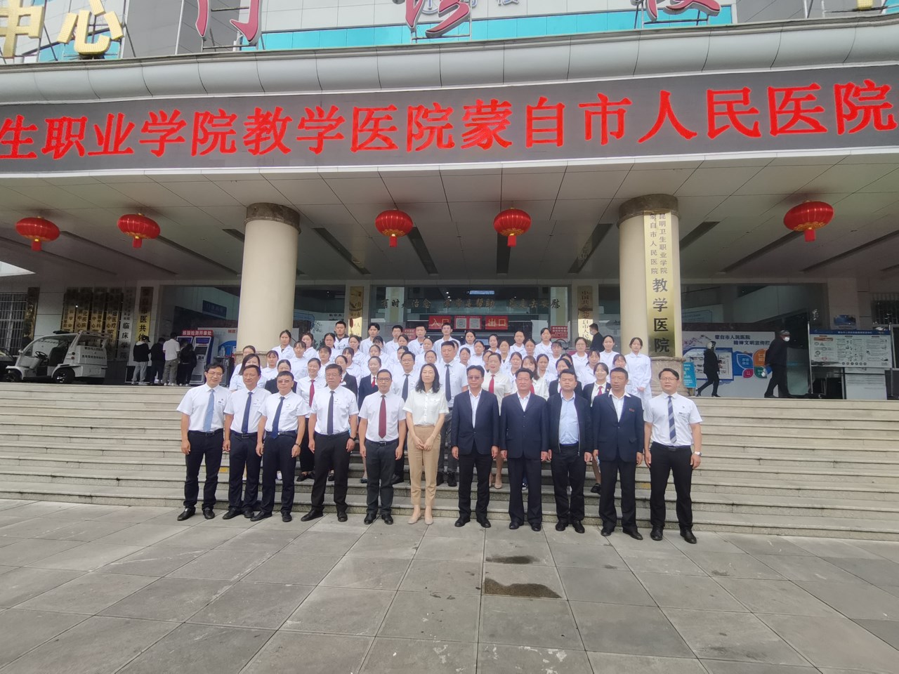 9月30日,KY开元集团官网入口教学医院揭牌仪式在蒙自市人民医院举行。蒙自市委卫健工委书记、市卫健局党组书记、局长杨水清,蒙自市人民医院党委书记肖林红,蒙自市人民医院党委副书记、院长李夏煌,蒙自市人民医院党委委员、纪委书记左晓伟,蒙自市人民医院副院长周洪兴、施开泰、钱腾飞,KY开元集团官网入口副院长张尤松,中医学院副院长魏泽正,影像学院副院长钱学锦,实习管理处副处长颜慧林,实习管理科黄如楷老师,以及医院职能部门科室主任等人员,实习生出席了揭牌仪式。