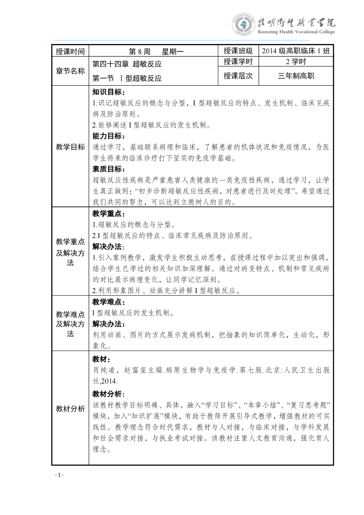 《Ⅰ型超敏反应》教案(病原生物学与免疫学)