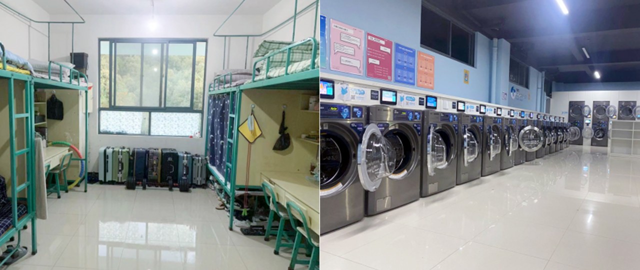 学生公寓的基础设施之前的每栋配备洗衣机、开水器,之后更换了功能更加齐全的洗衣机,以及根据学生需求,在每栋配备吹风机和充电宝自助式服务设备,维修线下变为线上、增设2人间和4人间、一卡通的整改、宿舍上网的便捷,1-12栋宿舍管理吧台的增设等等都给学生的生活带来了便利。
