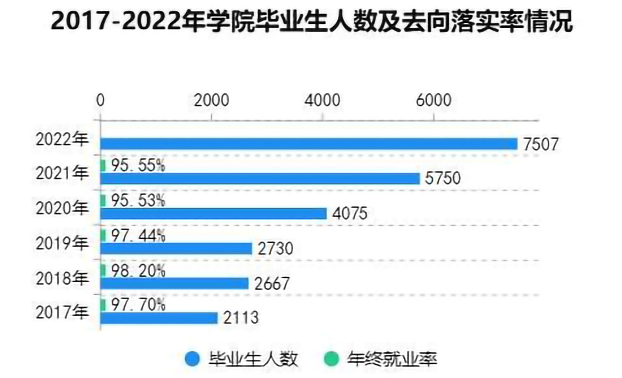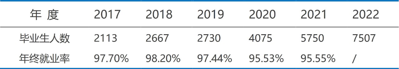 毕业生去向落实率是学校办学及社会对学校毕业生需求程度的重要指标和参考依据。2017年以来,学院学生队伍逐年壮大,毕业生人数从2017年2113人增至2022年的7507人,规模扩大三倍有余。历年年终毕业生去向落实率均稳定在95%以上。