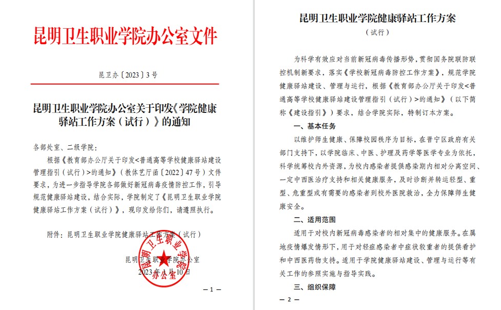 为科学有效应对当前新冠病毒传播形势,贯彻国务院联防联控机制新要求,落实《学校新冠病毒防控工作方案》,规范学院健康驿站建设、管理与运行,根据《教育部办公厅关于印发<普通高等学校健康驿站建设管理指引(试行)>的通知》(以下简称《建设指引》)要求,结合学院实际,学院于2023年1月10日制定了《学院健康驿站工作方案》,组建了学院健康驿站领导专班、下设医疗组、保供组、宣教组、转运组、心理组五个小组,细化明确了“入站、在站、出站”三个运行流程,并建立专业救治绿色通道。