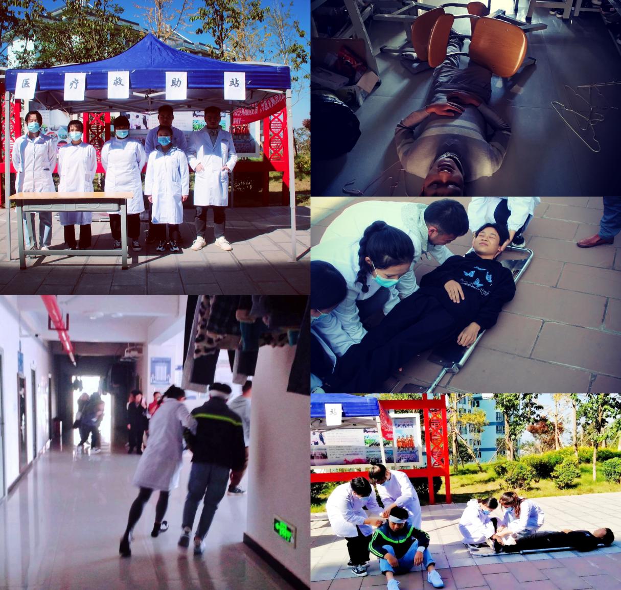医疗救助组人员迅速就位,模拟地震现场,等各宿舍公寓学生安全有序的撤离之后进入宿舍楼寻查是否有被困学生或者受伤学生,并安全的将被困学生及伤员带出宿舍楼到