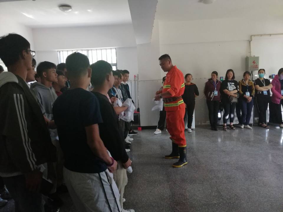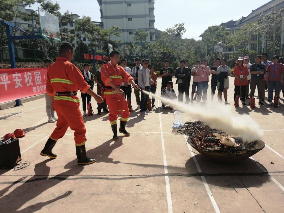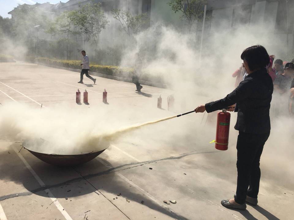在综合楼后面篮球场开展如何使用灭火器,由两名专业的老师示范灭火器的使用方法后,宿管老师模拟灭火器的使用方法和宿管会成员学习使用(注:灭火器过红线不可使用,绿线均可使用)。