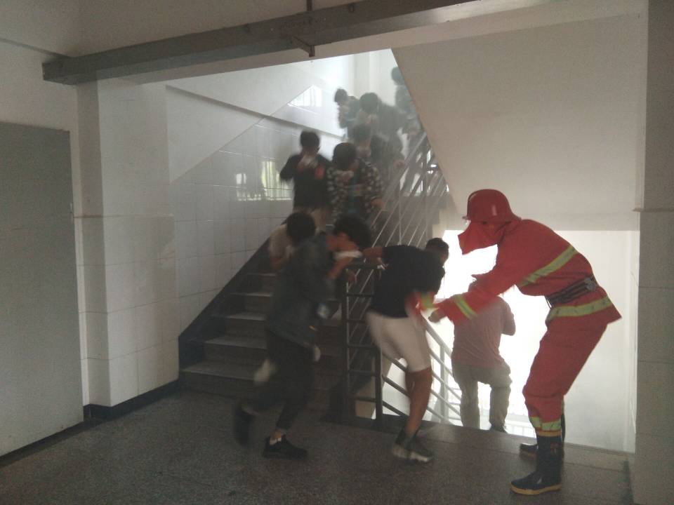 在一栋学生公寓由两名专业老师带领宿管会30名男生成员演练防火逃生,会长陶媛负责释放警报音乐,宿管会女生把一栋学生公寓周围堵上以防止外来人员乱入,发生意外事件,一些人员在一楼清点人员30名男生均到齐。