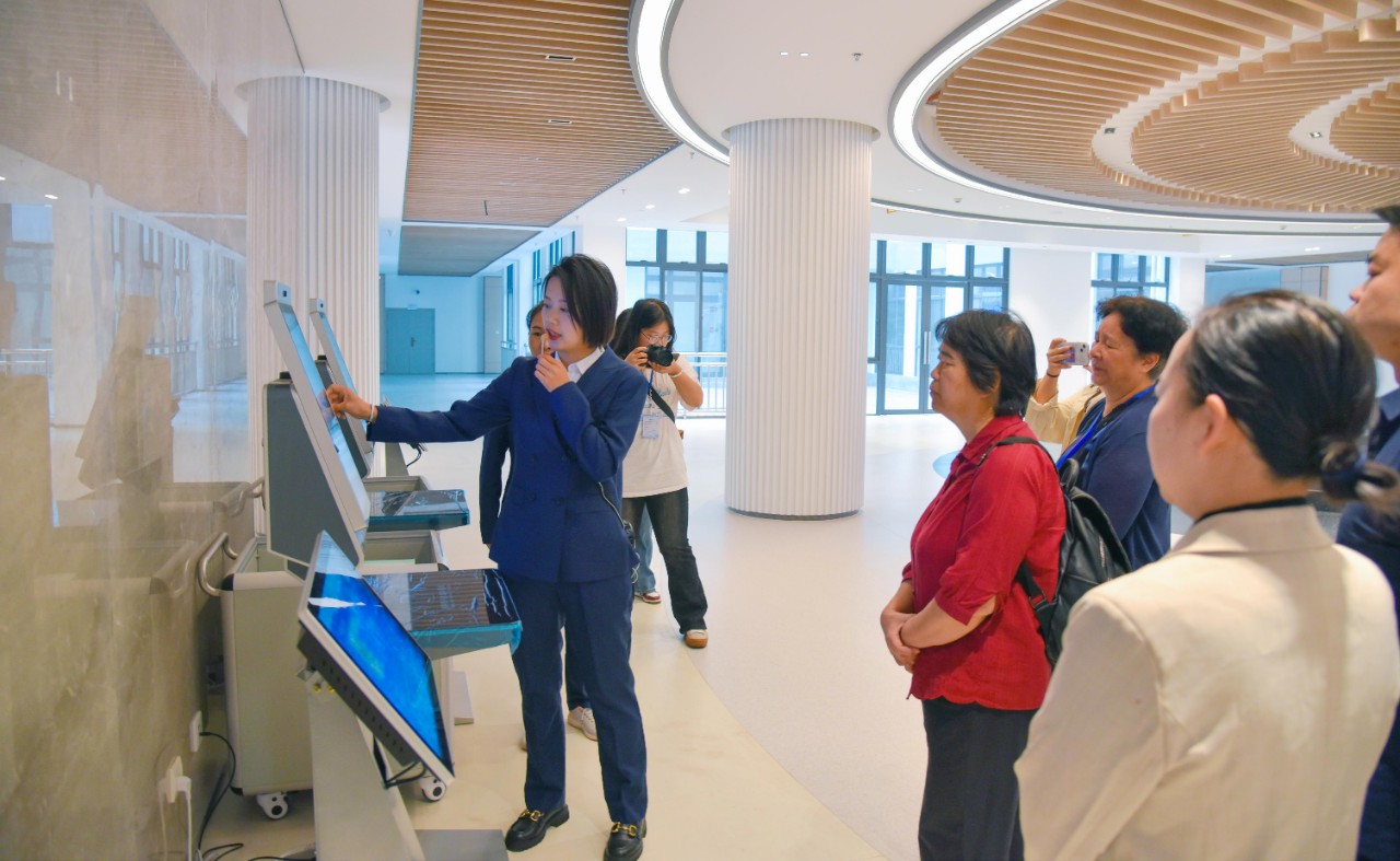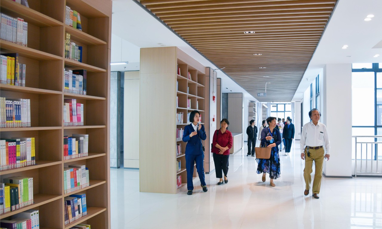 揭牌仪式结束后,领导嘉宾和师生代表有序进入新图书馆内参观体验,图书馆工作人员逐一讲解图书馆特色馆藏及自助借还等文献服务功能。