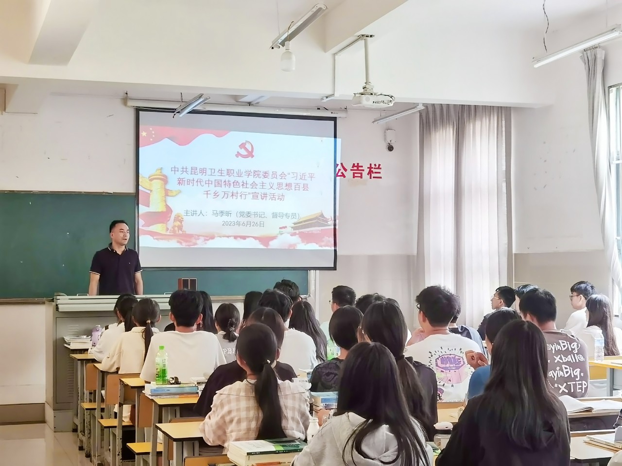 在主题教育“习近平新时代社会主义思想百县千乡万村行”如火如荼开展之时,为深入开展学习贯彻习近平新时代中国特色社会主义思想主题教育和党的二十大精神,全面学习贯彻习近平总书记在中央政治局第五次集体学习时的重要讲话精神和致云南大学建校100周年重要贺信精神,扎实推进习近平新时代中国特色社会主义思想进教材、进课堂、进头脑。2023年6月26日学院党委书记马季昕走进“形势与政策”思政课堂,以“中国式现代化之路”为题,为同学们讲授了一堂紧扣主题、生动鲜活的思政课。