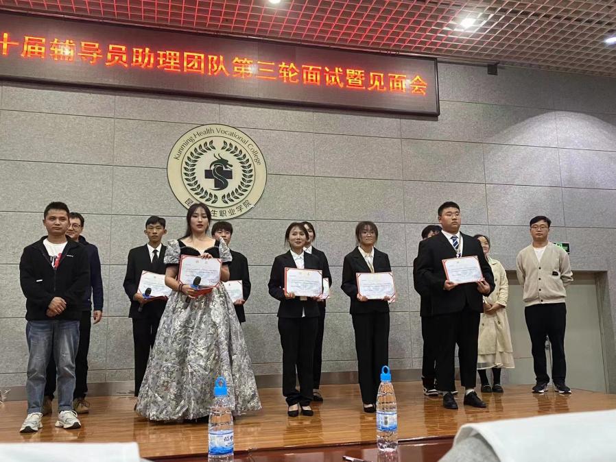 第三项议程由各评委老师上台为第九届辅导员助理团队颁发评书,并上台与全体第九届辅导员助理团队合影留念。