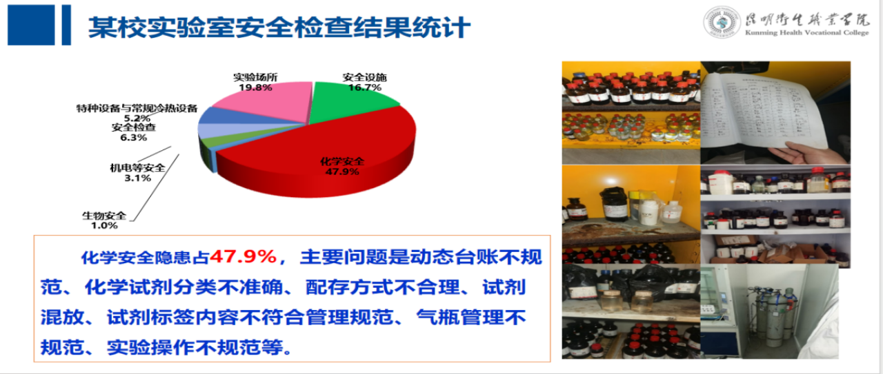 其次,针对实验室安全检查项目表中的检查内容,提出了实验室安全检查要点。从实验场所安全、安全实施、基础安全、化学安全、生物安全、特种设备与常规冷热设备安全等方面讲解了实验室安全检查的关注要点及针对出现安全隐患的整改措施。