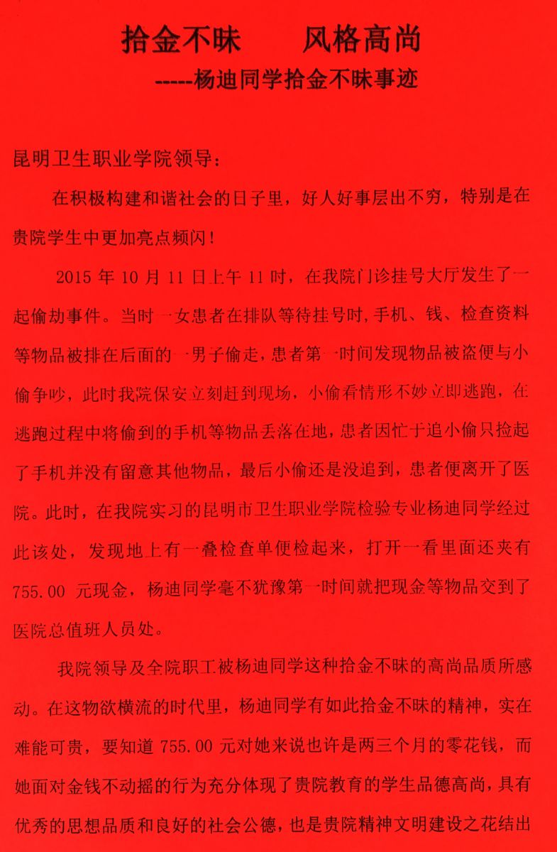 官渡区人民医院发来KY开元实习生杨迪同学拾金不昧表扬信