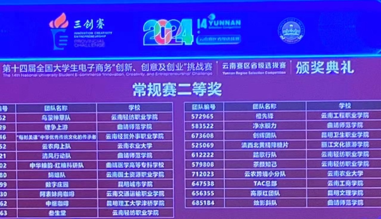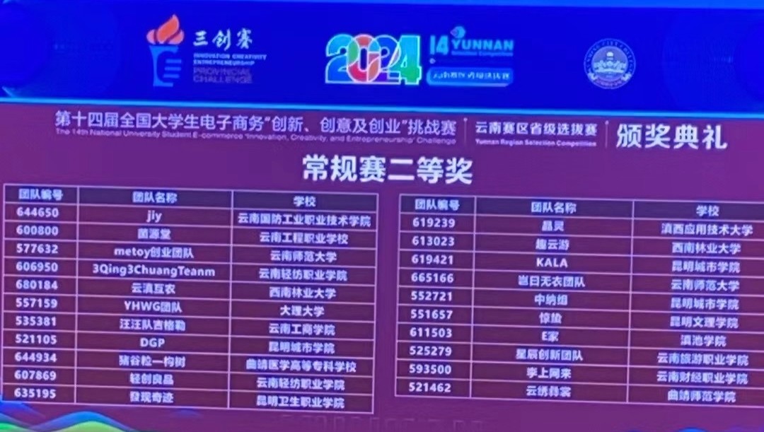 第十四届全国大学生电子商务“创新、创意及创业”挑战赛云南赛区省级选拔赛(以下简称“三创赛”省赛)于2024年5月30日-6月1日在昆明城市学院(杨林校区)举办。本次“三创赛”省赛由“三创赛”组委会主办,昆明城市学院承办。通过全国三创赛官网后台查询获悉今年云南省有效报名团队数为6121支,其中,常规赛道5338项,实战赛道738项。经过各资格合规审查、校赛全省晋级省赛总名额为311支,其中,常规赛道240支,实战赛道71支。学院进入“三创赛”省赛常规赛道的项目有3个,分别为:“巨美巨爱”-诺千眼镜,防脱养护药浴干发帽、易烤鲜。