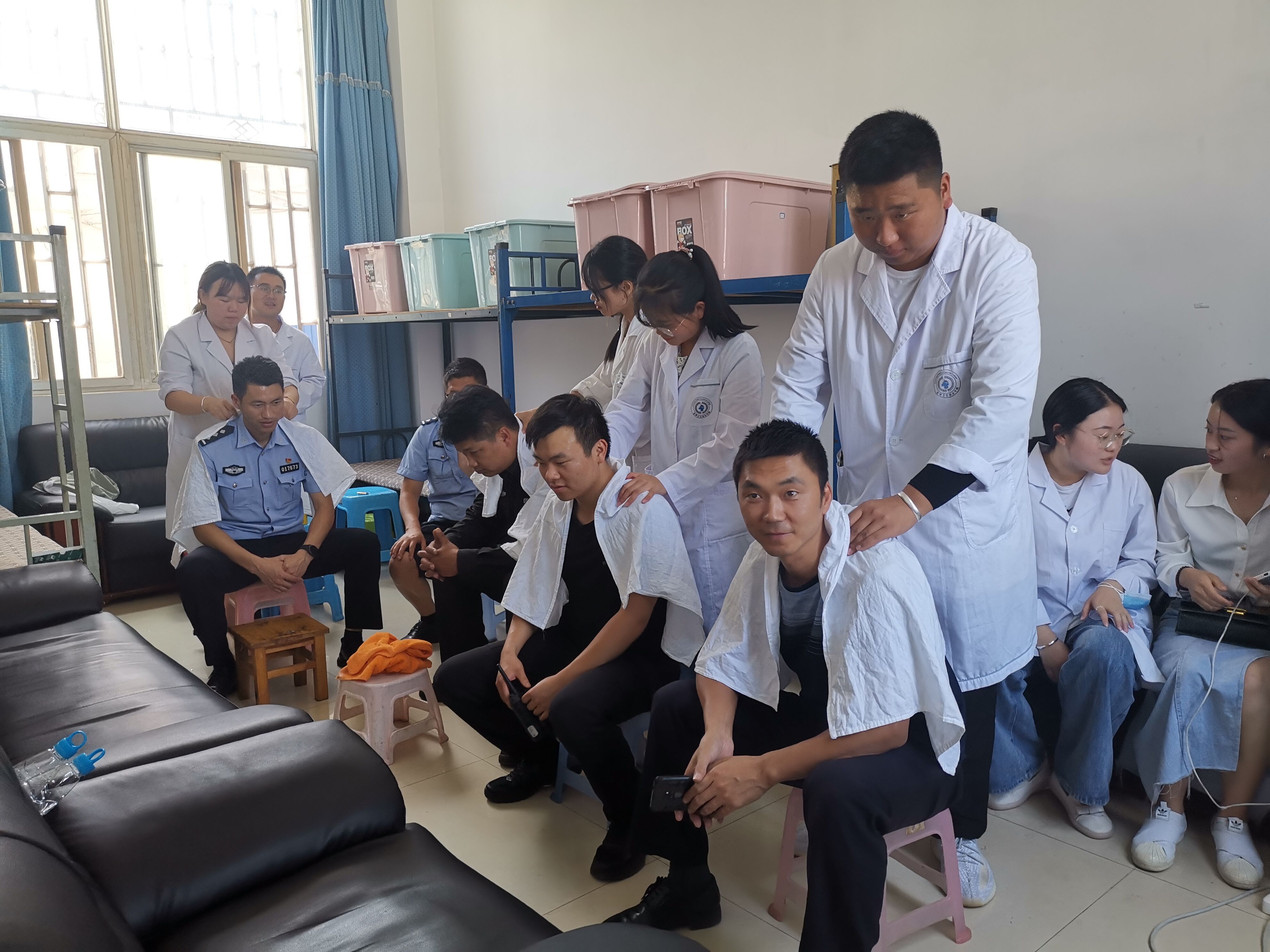 学院理疗团队的同学们结合专业特色,让晋城镇派出所的100位民警依次体验了推拿、足疗、拔火罐、艾灸等传统中医理疗项目。