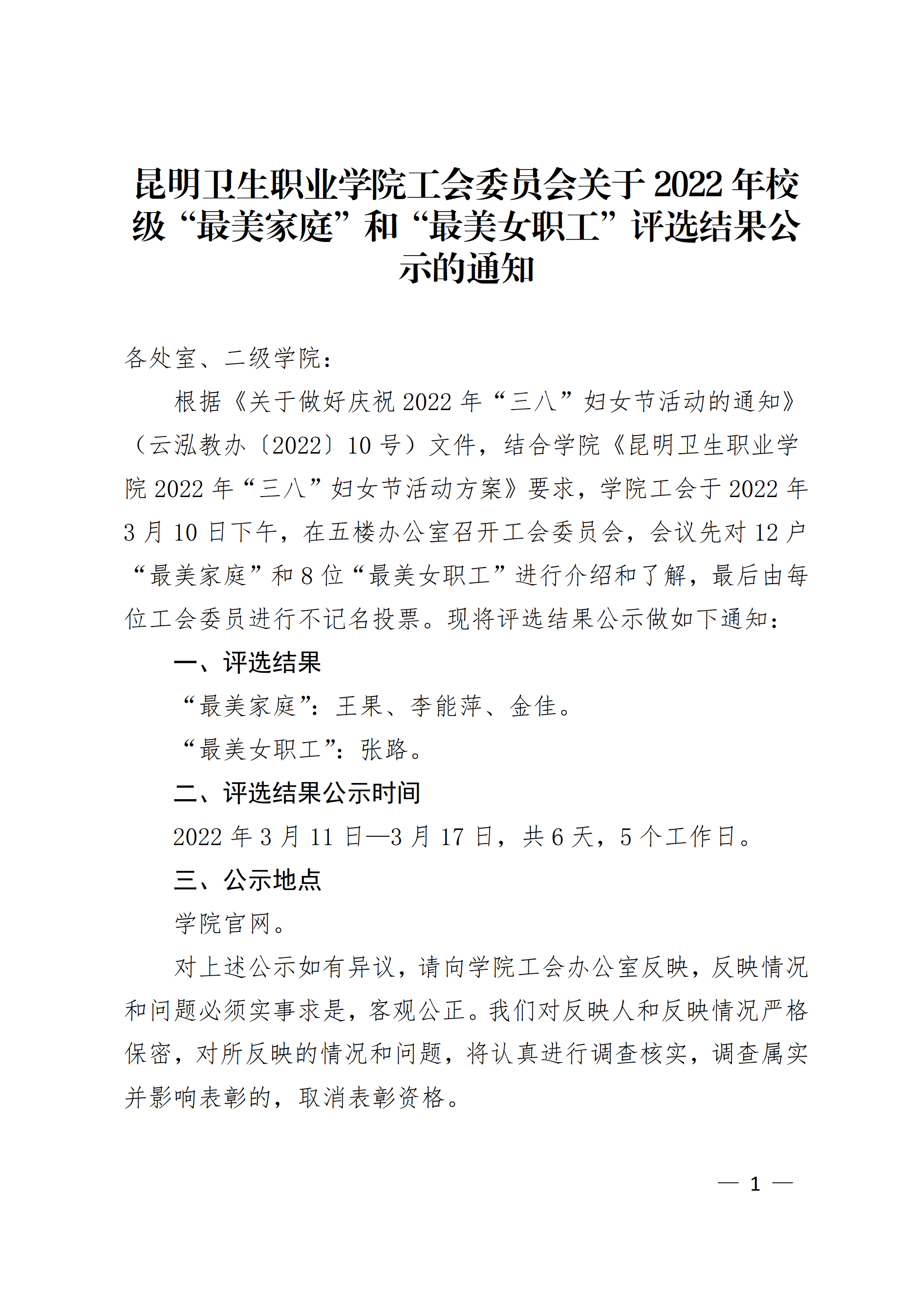 KY开元集团官网入口工会委员会关于2022年校级“最美家庭”和“最美女职工”评选结果公示的通知