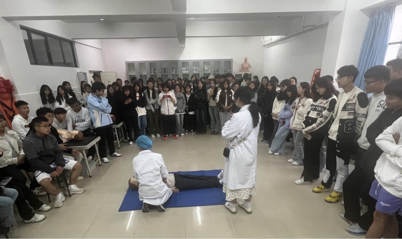 为进一步提高公共学院体育教研室、体测中心教师和助教在突发事件中的应急救护能力和掌握基本的急救技能,以及止血术、包扎术、固定术、搬运术等院前急救技术,中暑、休克、心脏骤停等常见户外急救处理常识,切实保障师生的生命安全。教务处组织临床学院为公共学院体育教研室、体测中心全体教师和助教提供急救知识普及培训工作。