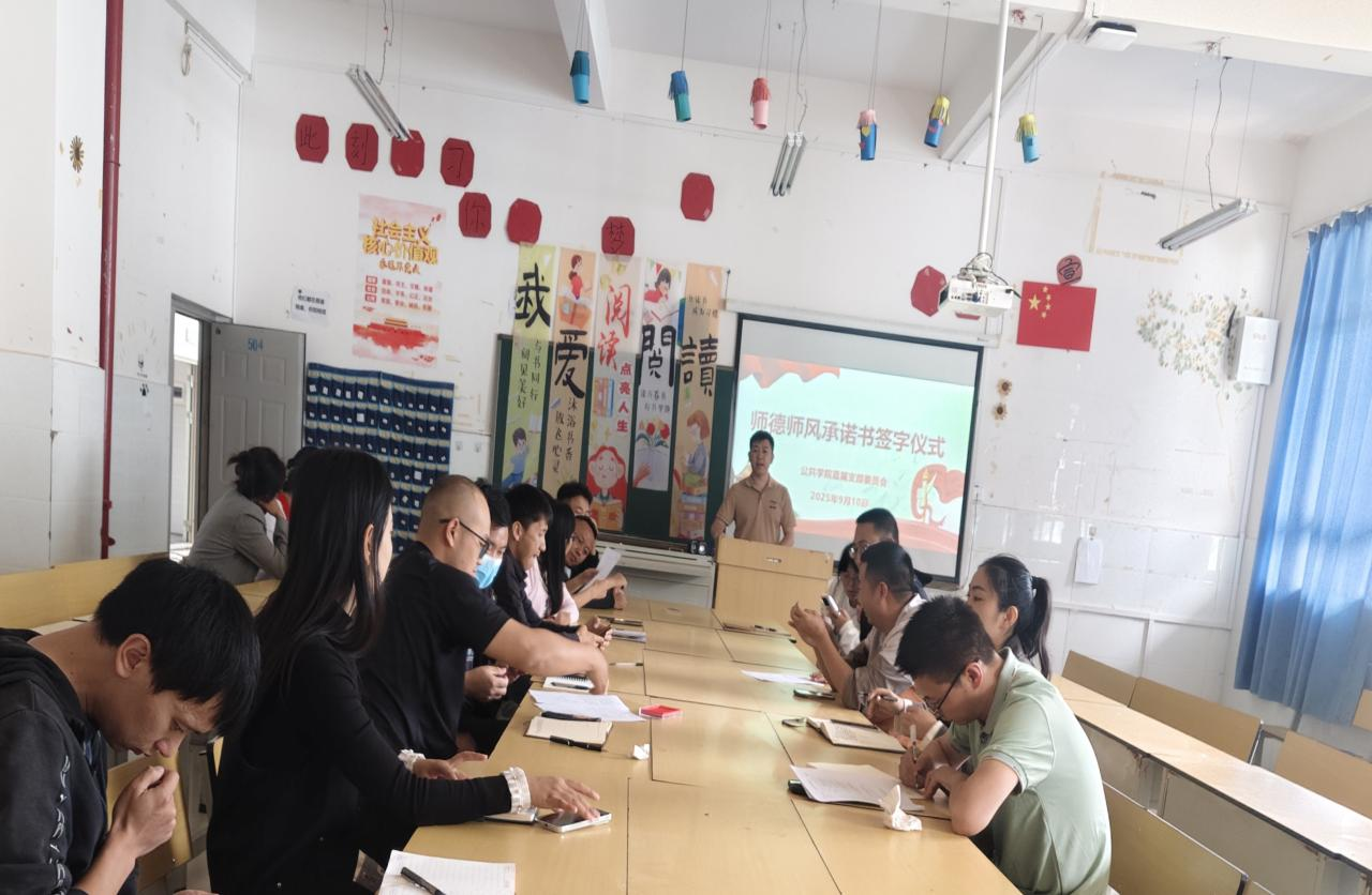 在第41个教师节到来之际,为深入贯彻落实立德树人根本任务,强化教师队伍师德师风建设,2025年9月10日,公共学院直属党支部在公共学院504隆重举行师德师风承诺书签字仪式。支部全体教师党员齐聚一堂,以庄重承诺彰显育人担当,以实际行动诠释教育初心。仪式伊始,支部书记王正安同志向老师们详细阐述了师德师风建设的重要意义,强调师德是教师职业的灵魂,关乎教育事业的发展与学生的成长。随后,老师们依次走到桌前,拿起笔,在师德师风承诺书上郑重签下自己的名字,并按下手印,每一个动作都传递出对坚守师德规范、践行育人使命的坚定态度。