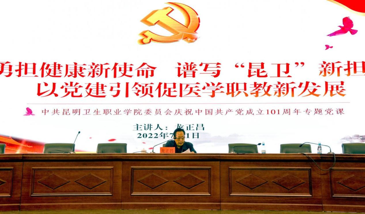 2022年7月1日,为庆祝中国共产党成立 101 周年,巩固党史学习教育成果,以优异成绩迎接党的二十大胜利召开, 在学院“七一”表彰之际,学院党委书记龙正昌同志以《勇担健康新使命 谱写“昆卫”新担当;以党建引领促医学职教新发展》为主题讲了一堂专题党课。公共学院党支部全体党员、入党积极分子到场聆听。