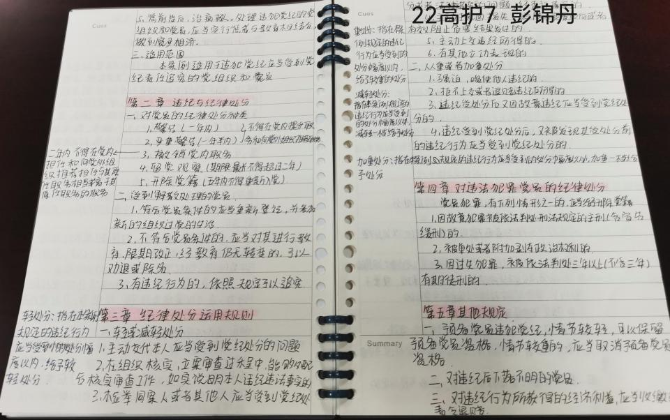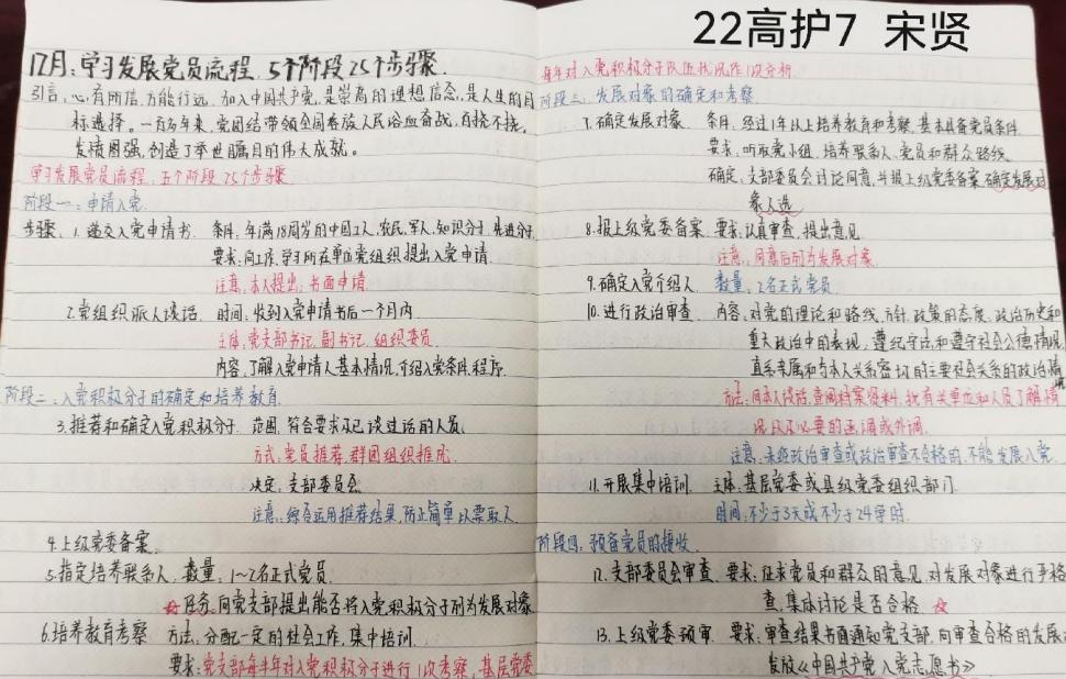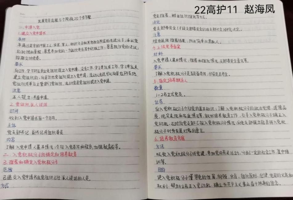 按照护理学院第一党支部统一安排部署,此次评选活动主要围绕“记录齐全、内容详实、格式规范、字迹工整、页面整洁”等方面对支部自愿上交的36份学习笔记进行评比,着重了解党员、入党积极分子、入党申请人的学习态度与学习深度。经过综合评审,最终赵海凤、彭锦丹、李利、陈晓蓉、姚庆玲、宋贤6名同学的笔记被评为优秀笔记,并在全院范围内予以通报表扬。下面是护理学院第一党支部评选出的优秀学习笔记,让我们来看看吧!(排名不分先后)
