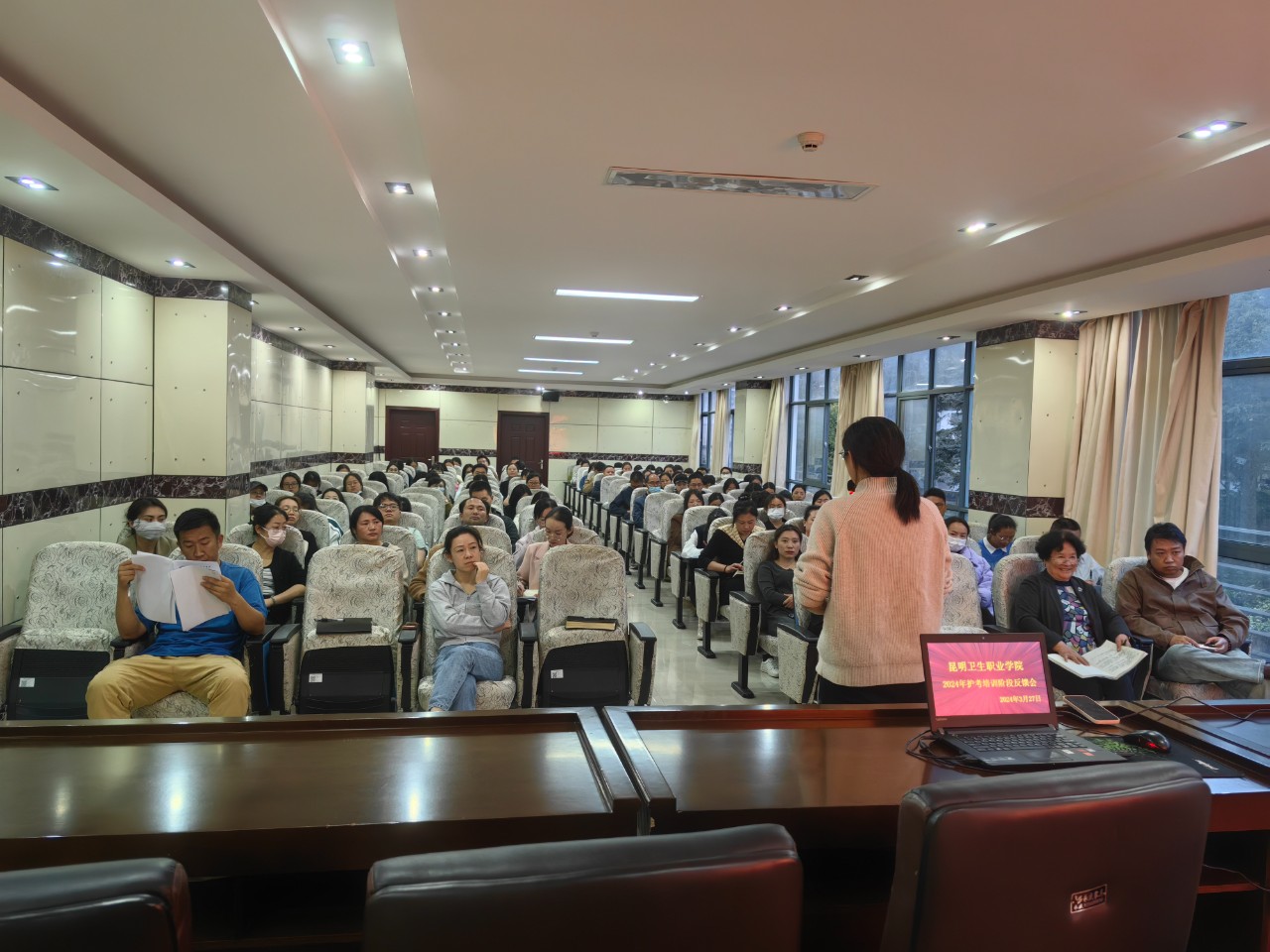 经过五个星期的努力奋战,2024年护考培训已经完成了第一部分护考精讲课程,为了让全体师生稳扎稳打,继续完成护考培训的复习串讲、试题精讲课程,3月27日19:30在KY开元行政楼四楼会议室召开2024年护考培训阶段反馈会。KY开元集团官网入口副院长李玉晶,教务处处长孟州令,继续教育学院院长王思权,大学生工作部部长郭佶颖,护理学院院长蒋淑昆、副院长周璇、学管副院长王宇超,护理专业全体教师及班主任参加本次会议。