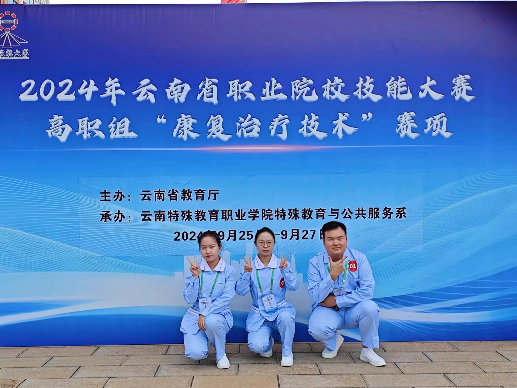 在2024年云南省职业院校技能大赛高职组“康复治疗技术”赛项中,由陈莹、李姣教师指导的,来自2022级三年制专科康复1班童绍芬、蔡凤露和2022级三年制专科康复2班李红香,同心协力,凭借过硬的心理素质和扎实的专业技能,荣获一等奖;同时由刘瑞琴、龙思思教师指导的,来自2022级三年制专科康复2班李蕊、孟正尧和2022级三年制专科康复1班周芸旭,荣获二等奖。