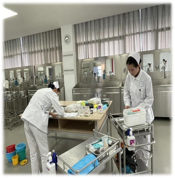 备物组在护理学院506同步展开“隐形战斗”。备物老师带领团队严格执行“10分钟备物标准”,从急救物品清点到模拟静脉输液的血管模型调试,每个环节都力求与临床场景无缝对接。正是学院“贴近临床、服务实战”教学理念的生动体现。