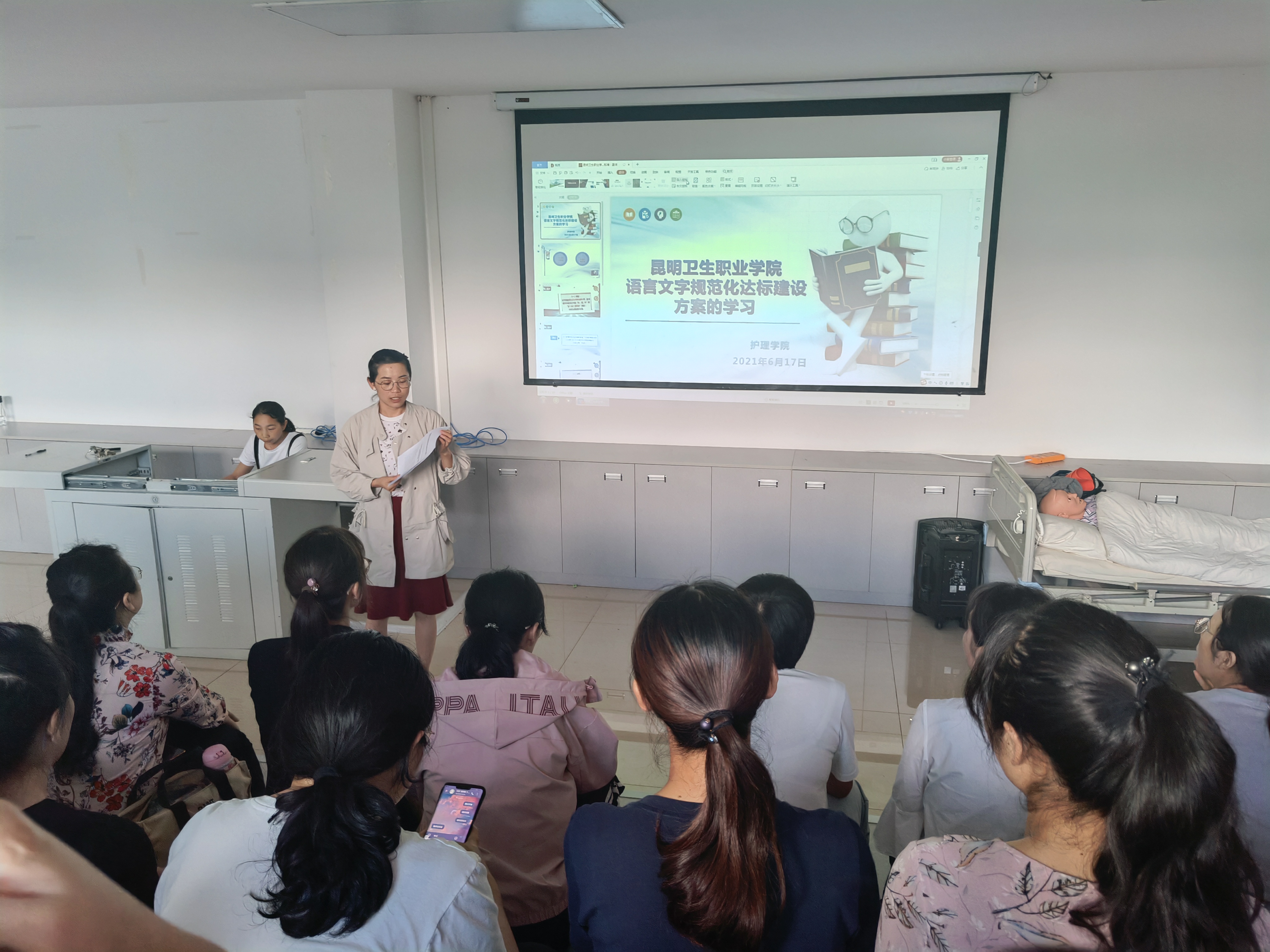 学校是语言文字工作的基础阵地,做好语言文字工作、加强语言文化建设,是学校的责任和义务。KY开元始终把语言文化建设工作作为重中之重,常抓不懈。为顺利完成语言文字规范化达标评估验收,促进学院语言文字规范化健康发展,切实提高全院教师的语言文字规范意识,护理学院于6月17日17:15在护理学院101教室举行以“语言文字规范化达标建设”为主题的教师培训会,护理学院全体教师参加了培训。