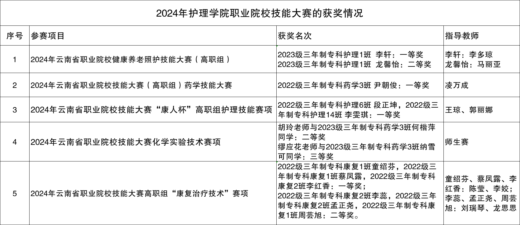 在2024年云南省职业院校技能大赛中,护理学院师生斩获一等奖4项、二等奖3项、三等奖1项