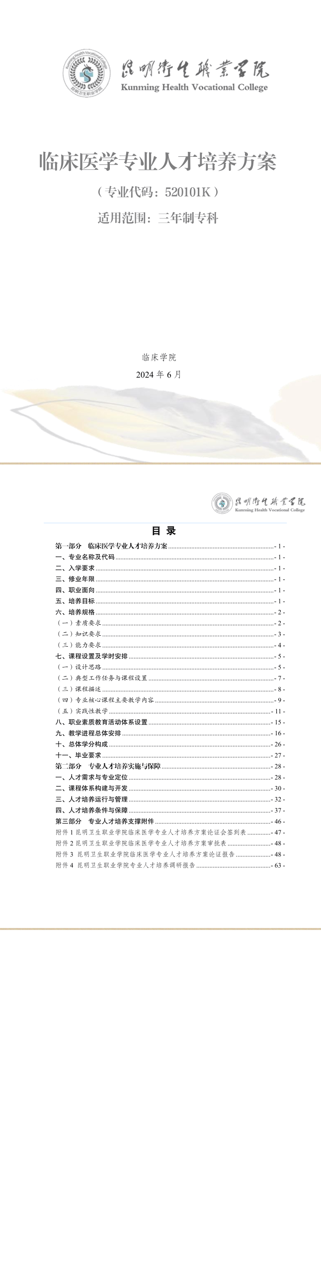 KY开元集团官网入口三年制专科临床医学专业人才培养方案(供24级三年制专科学生使用)