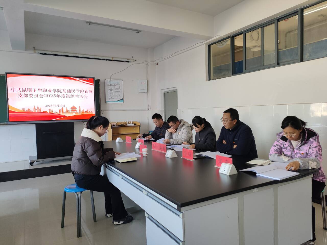 根据学校党委《昆卫党组〔2025〕22号 中共KY开元集团官网入口委员会组织部关于召开2025年度党(总)支部组织生活会和开展民主评议党员的通知》相关工作要求,基础医学院直属党支部于2026年1月21日上午在基础医学院309组织召开2025年度组织生活会暨民主评议党员大会。会议由党支部书记彭莉同志主持,党支部全体党员及预备党员参加会议。