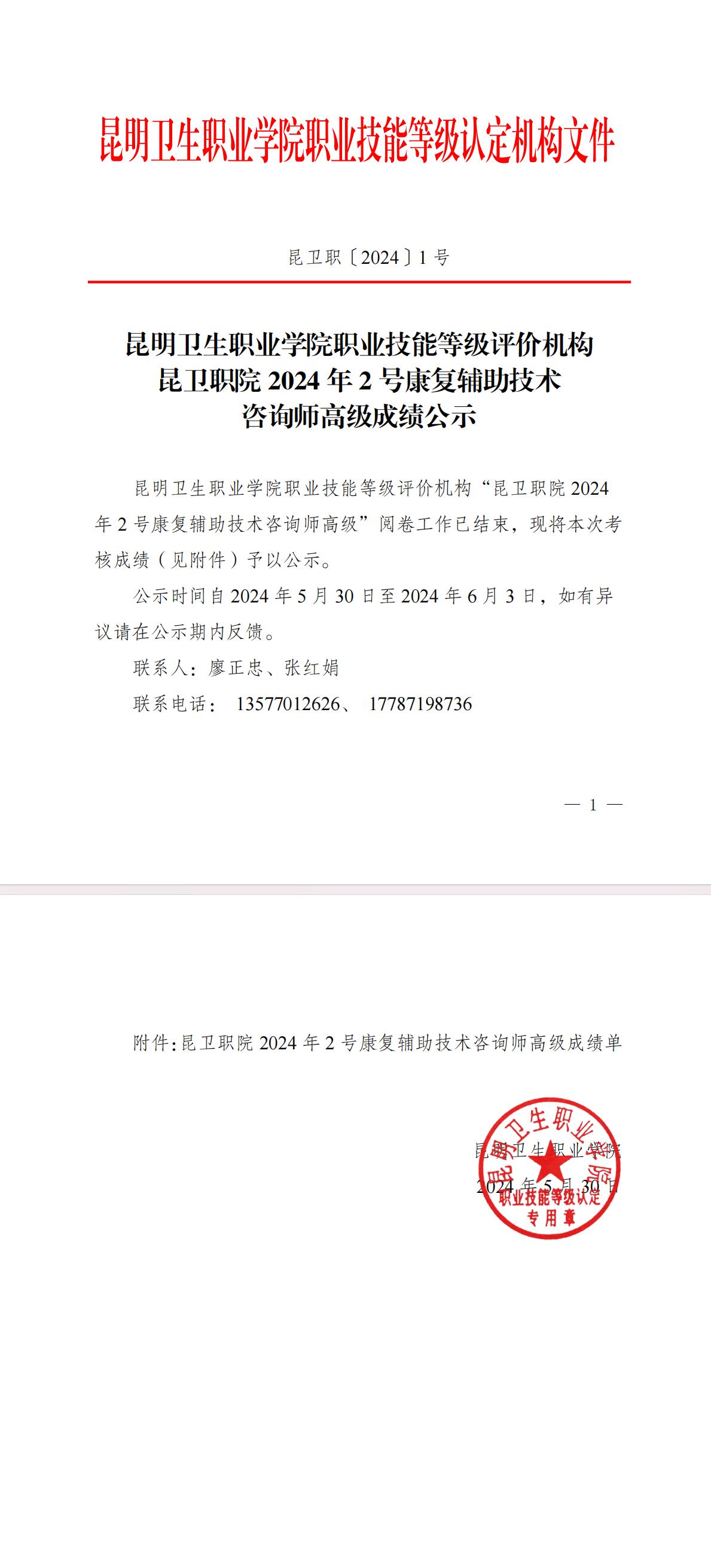 KY开元集团官网入口职业技能等级评价机构昆卫职院2024年2号康复辅助技术咨询师高级成绩公示