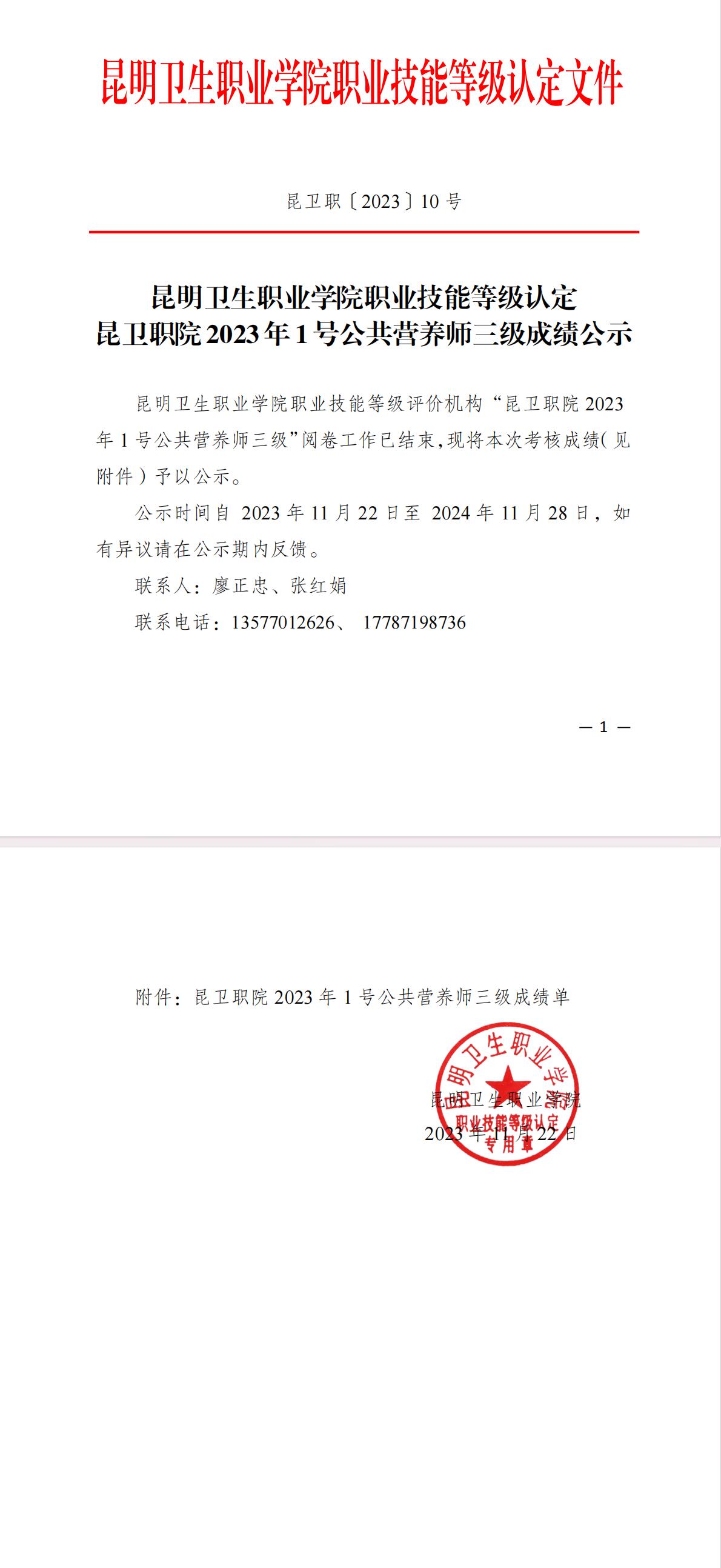 附件昆卫职院2023年1号公共营养师三级成绩单.pdf