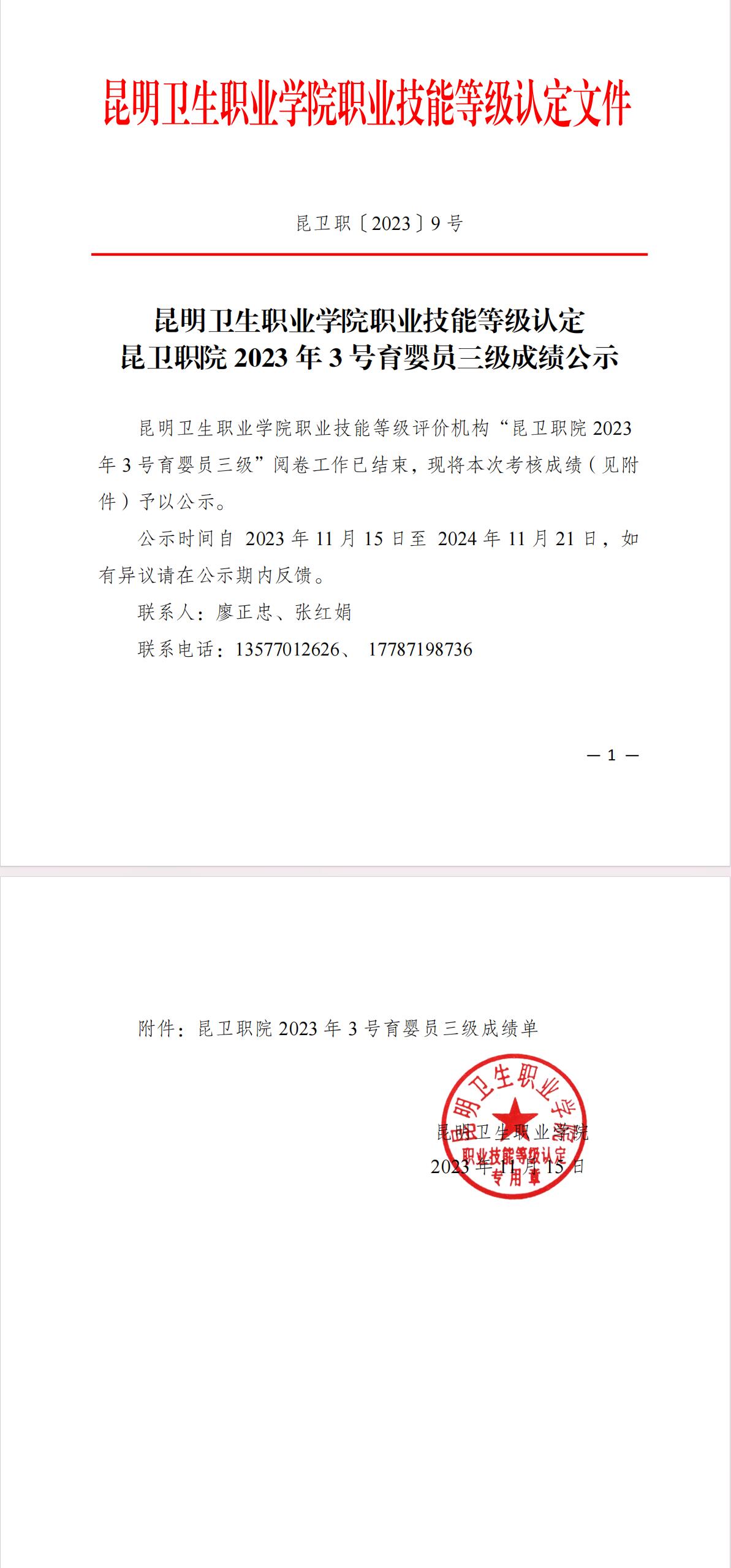附件昆卫职院2023年3号育婴员三级成绩单.pdf