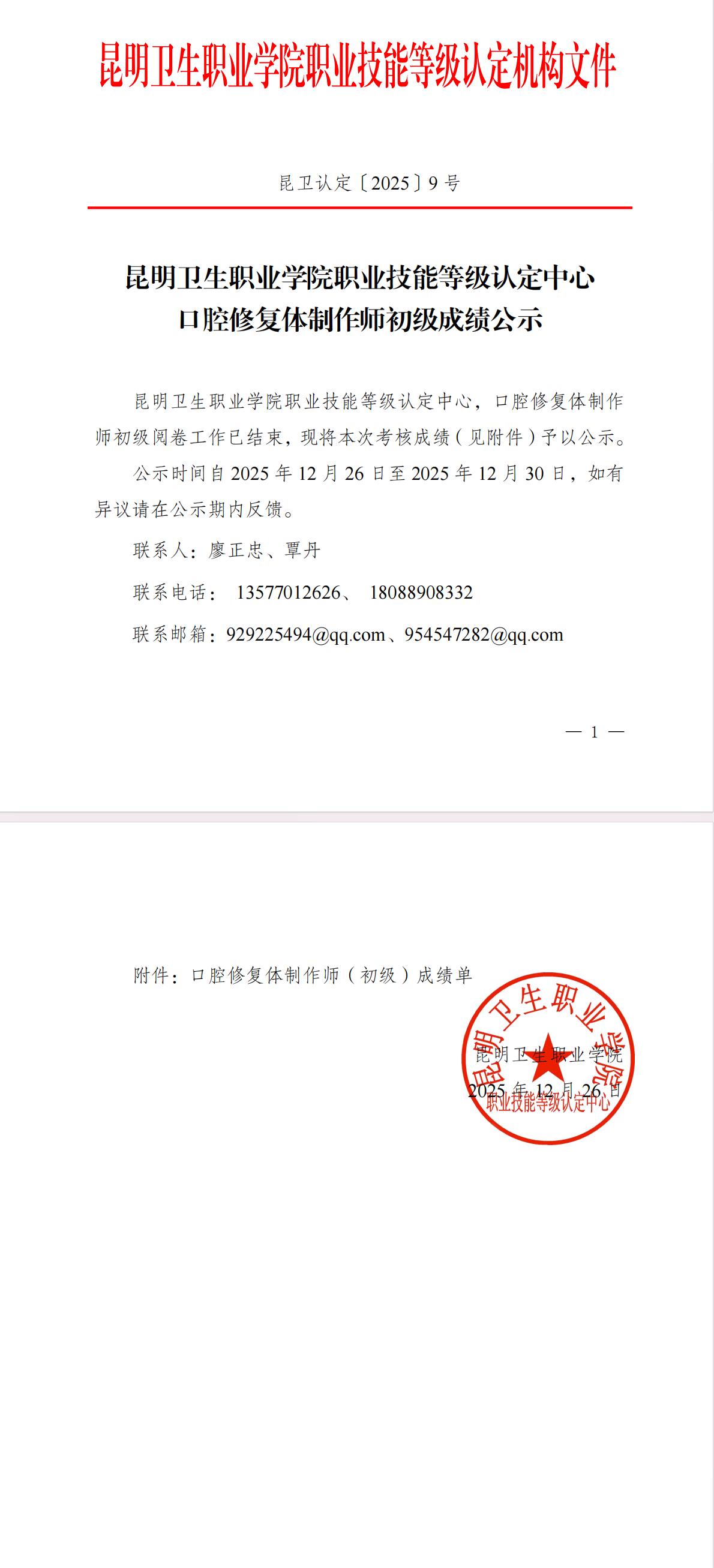 昆卫认定2025-9号文件-口腔修复体制作师初级成绩公示