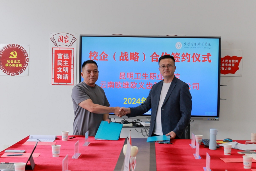 2024 年 6 月 3 日下午15 时,KY开元集团官网入口与云南欧维欧义齿科技有限公司的校企合作协议书签约仪式在口腔学院三楼会议室隆重举行。