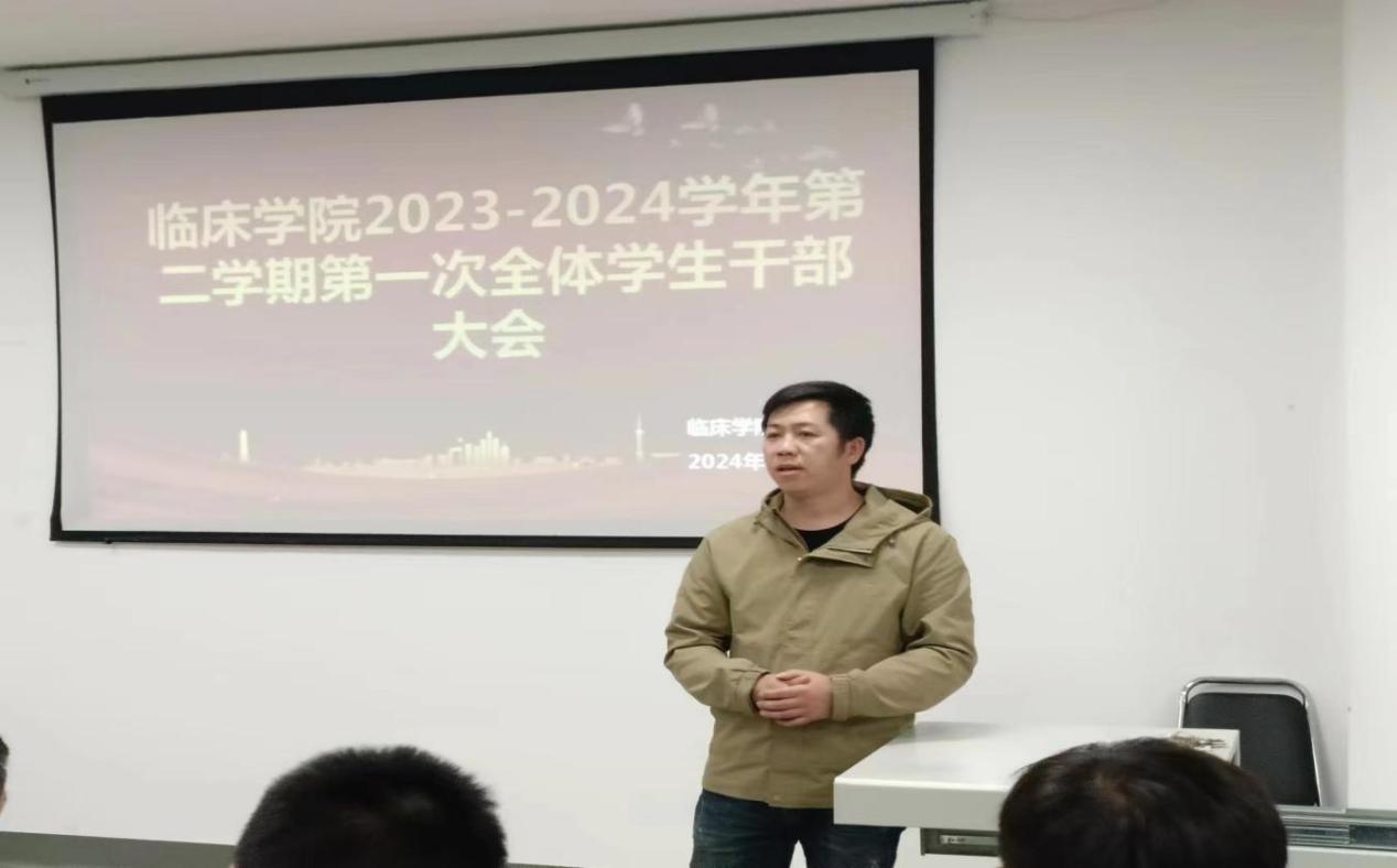 为进一步加强临床学院师生沟通联动,倾听学生心声,解决学生在校的实际困难和问题,提升学生管理服务水平,加强学生思想政治教育工作,3月7日晚,临床学院组织学生班干部代表在影像学院208室召开2023-2024学年第二学期第一次全体学生干部大会。临床学院学生管理负责人李建国、教学管理副院长唐敏、教学办主任邱亚、学管办主任敖宇蓉、临床学院党总支部书记王正安、一支部书记王德昌、二支部书记杨林杰以及学生干部代表参加,本次会议由李建国老师主持召开。