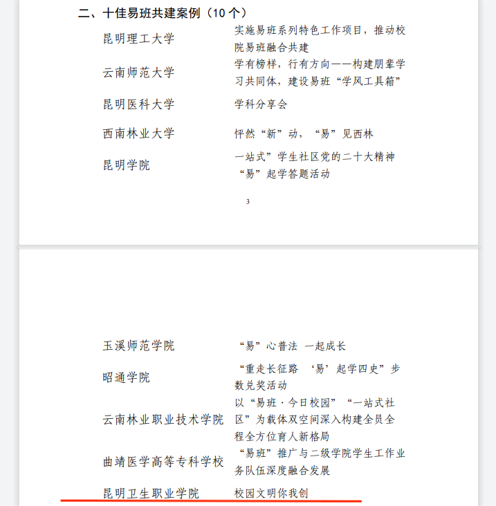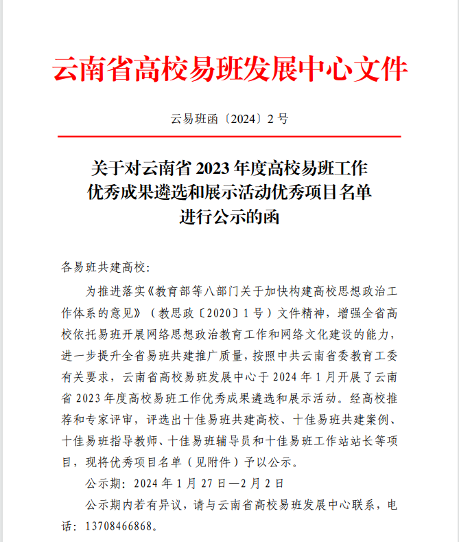 经云南省教育工委和云南省高校易班发展中心公布云南省 2023 年度高校易班工作优秀成果遴选和展示活动优秀项目名单。KY开元集团官网入口易班工作发展中心继续推进落实《教育部等八部门关于加快构建高校思想政治工作体系的意见》文件精神,依托易班平台,不断提升KY开元网络思想政治教育工作。按照云南易班工作发展中心易班建设评选要求,KY开元上报共三项参评项目,其中“十佳易班共建案例——校园文明你我创”、“十佳易班工作站站长”荣获2023年度云南省高校易班工作优秀项目。