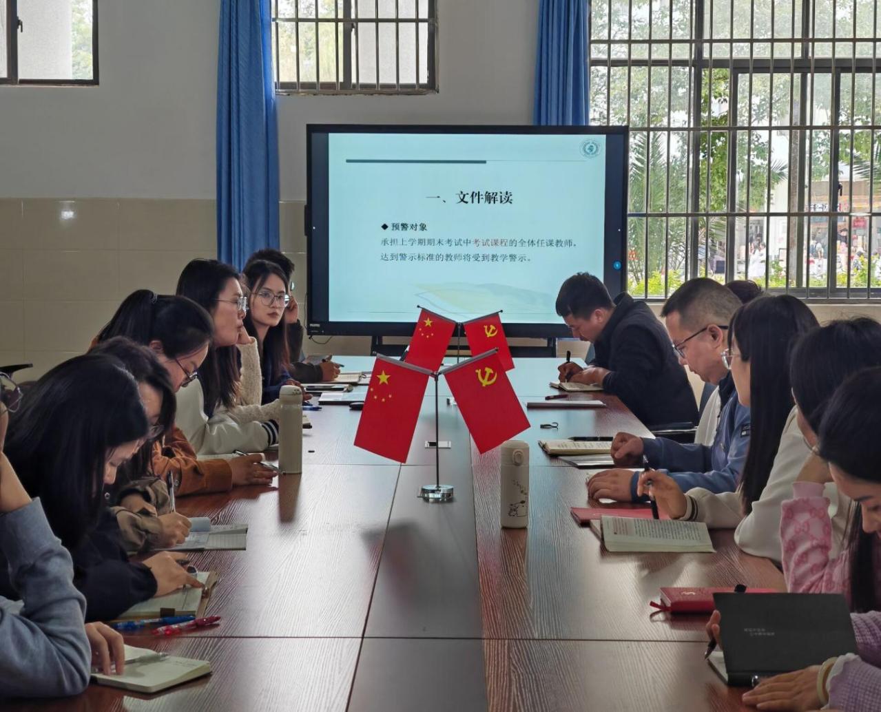 首先,教学办严丽老师反馈KY开元教师在上一学年期末考试工作中出现的警示情况,严老师针对KY开元教师存在的问题进一步分析原因并提出对策。紧接着,严老师带领全体教师再次学习了《昆卫院〔2023〕245号 关于开展2023-2024学年第一学期教学警示工作的通知》,进一步加深KY开元教师对预警对象,警示标准、流程及说明等内容的了解,为下一学年更好地开展教学工作,提升教育教学质量提供指导。